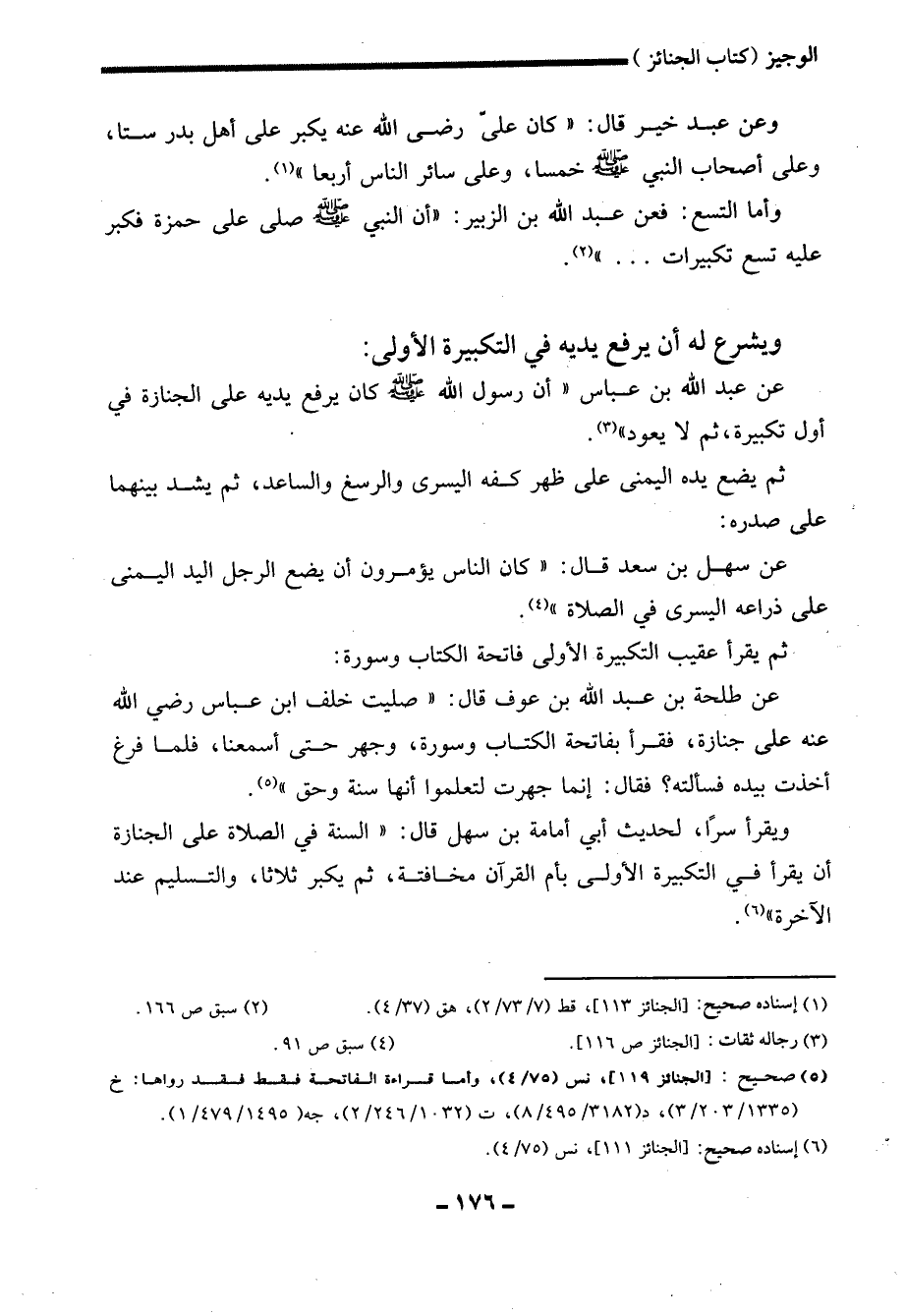 (¬5) صحيح: [الجنائز 119]. نس (75/ 4)، وأما قراءة الفاتحة فقط فقد رواها: خ (1335/ 203/3)، د (3182/ 495/8)، ت (1032/ 246/ 2)، جه (1495/ 479/ 1).