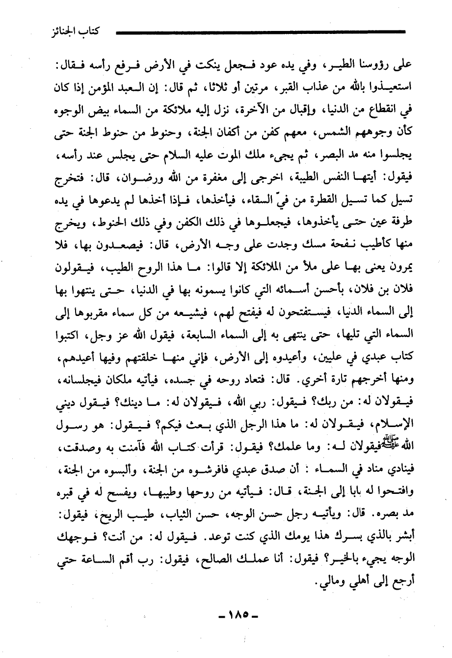 على رؤوسنا الطير، وفي يده عود فجعل ينكت في الأرض فرفع رأسه فقال: استعيذوا بالله من عذاب القبر، مرتين أو ثلاثًا، ثم قال: إن العبد المؤمن إذا كان في انقطاع من الدنيا، وإقبال من الآخرة، نزل إليه ملائكة من السماء بيض الوجوه كان وجوههم الشمس، معهم كفن من اكفان الجنة، وحنوط من حنوط الجنة حتى يجلسوا منه مد البصر، ثم يجىء ملك الموت عليه السلام حتى يجلس عند رأسه، فيقول: أيتها النفس الطيبة، اخرجى إلى مغفرة من الله ورضوان، قال: فتخرج تسيل كما تسيل القطرة من في السقاء، فيأخذها، فإذا أخذها لم يدعوها في يده طرفة عين حتى يأخذوها، فيجعلوها في ذلك الكفن وفي ذلك الحنوط، ويخرج منها كأطيب نفحة مسك وجدت على وجه الأرض، قال: فيصعدون بها، فلا يمرون يعني بها على ملأ من الملائكة إلا قالوا: ما هذا الروح الطيب، فيقولون فلان بن فلان، بأحسن أسمائه التي كانوا يسمونه بها في الدنيا، حتى ينتهوا بها إلى السماء الدنيا، فيستفتحون له فيفتح لهم، فيشيعه من كل سماء مقربوها إلى السماء التي تليها، حتى ينتهى به إلى السماء السابعة، فيقول الله عَزَّ وَجَلَّ، اكتبوا كتاب عبدي في عليين، وأعيدوه إلى الأرض، فإني منها خلقتهم وفيها أعيدهم، ومنها أخرجهم تارة أخري. قال: فتعاد روحه في جسده، فيأتيه ملكان فيجلسانه، فيقولان له: من ربك؟ فيقول: ربي الله، فيقولان له: ما دينك؟ فيقول ديني الإِسلام، فيقولان له: ما هذا الرجل الذي بعث فيكم؟ فيقول: هو رسول الله - صلى الله عليه وسلم - فيقولان له: وما علمك؟ فيقول: قرأت كتاب الله فآمنت به وصدقت، فينادي مناد في السماء: أن صدق عبدي فافرشوه من الجنة، وألبسوه من الجنة، وافتحوا له بابا إلى الجنة، قال: فيأتيه من روحها وطيبها، ويفسح له في قبره مد بصره. قال: ويأتيه رجل حسن الوجه، حسن الثياب، طيب الريح، فيقول: أبشر بالذي بسرك هذا يومك الذي كنت توعد. فيقول له: من أنت؟ فوجهك الوجه يجيء بالخير؟ فيقول: أنا عملك الصالح، فيقول: رب أقم الساعة حتي أرجع إلى أهلي ومالي.