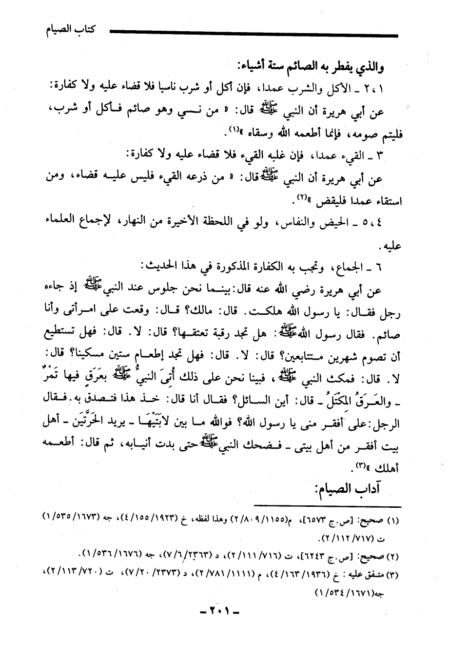 عن أبي هريرة رضي الله عنه قال: بينما نحن جلوس عند النبي -صلى الله عليه وسلم- إذ جاءه رجل فقال: يا رسول الله هلكت. قال: مالك؟ قال: وقعت على امرأتى وأنا صائم. فقال رسول الله - صلى الله عليه وسلم -: هل تجد رقبة تعتقها؟ قال: لا. قال: فهل تستطيع أن تصوم شهرين متتابعين؟ قال: لا. قال: فهل تجد إطعام ستين مسكينا؟ قال: لا. قال: فمكث النبي-صلى الله عليه وسلم-، فبينا نحن على ذلك اتِىَ النبيّ - صلى الله عليه وسلم - بعَرَق فيها تَمْرٌ -والعَرَقُ المِكْتَل- قال: أين السائل؟ فقال أنا قال: خذ هذا فتصدق به. فقال الرجل: على أفقر مني يا رسول الله؟ فوالله ما بين لابَتَيْهَا -يريد الحَرَّتيَن- أهل بيت أفقر من أهل بيتى- فضحك النبي - صلى الله عليه وسلم - حتى بدت أنيابه، ثم قال: أطعمه أهلك" (¬3).