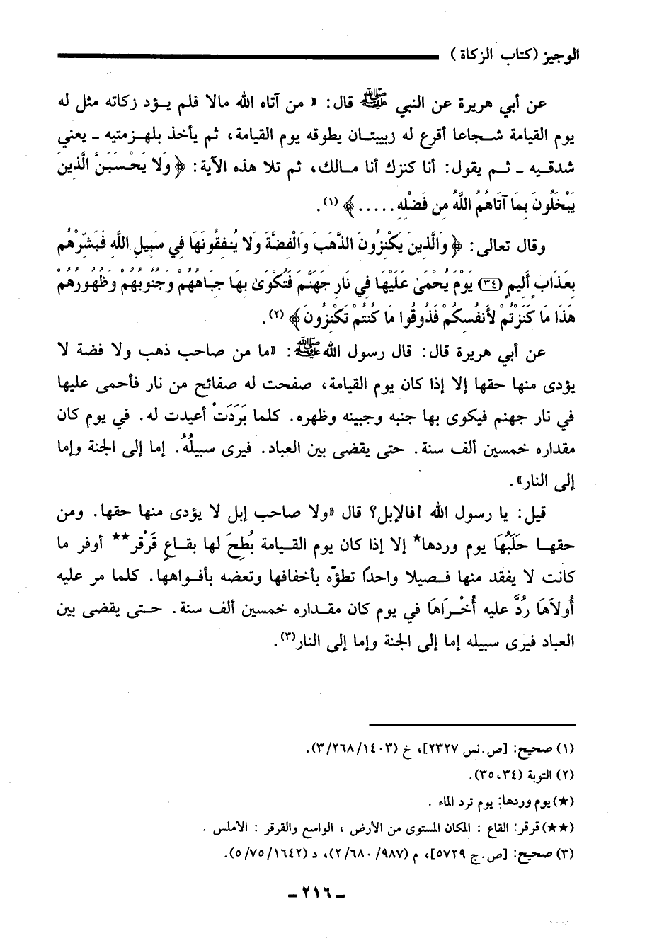 عن أبي هريرة قال: قال رسول الله - صلى الله عليه وسلم -: "ما من صاحب ذهب ولا فضة لا يؤدى منها حقها إلا إذا كان يوم القيامة، صفحت له صفائح من نار فأحمى عليها في نار جهنم فيكوى بها جنبه وجبينه وظهره. كلما بَرَدَتْ أعيدت له. في يوم كان مقداره خمسين ألف سنة. حتى يقضى بين العباد. فيرى سبيلُهُ. إما إلى الجنة واما إلى النار".