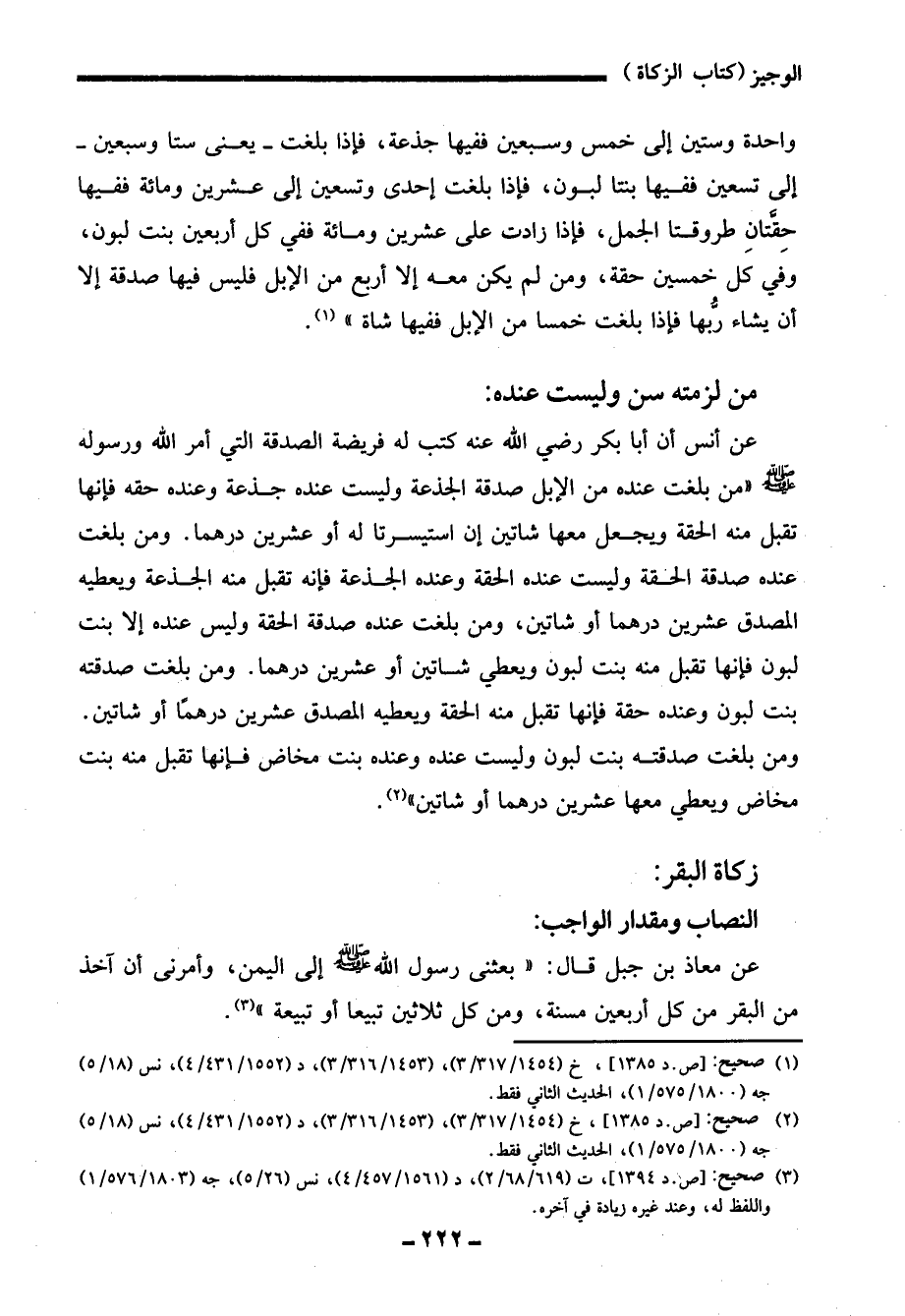 عن معاذ بن جبل قال: "بعثنى رسول الله - صلى الله عليه وسلم - إلى اليمن، وأمرنى أن آخذ من البقر من كل أربعين مسنة، ومن كل ثلاثين تبيعا أو تبيعة" (¬3).