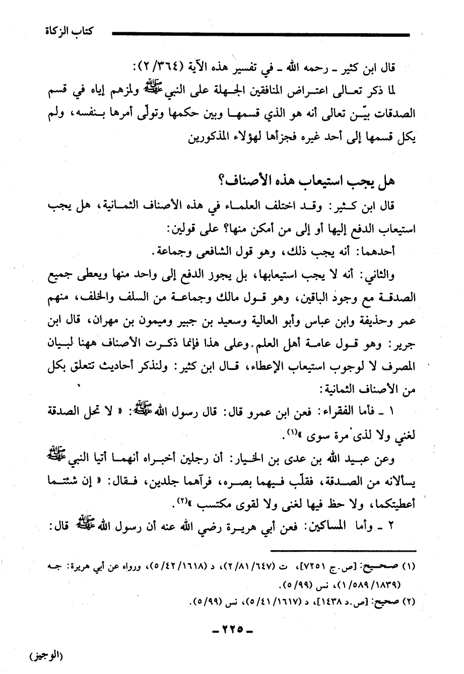 قال ابن كثير: وقد اختلف العلماء في هذه الأصناف الثمانية، هل يجب استيعاب الدفع إليها أو إلى من أمكن منها؟ على قولين: