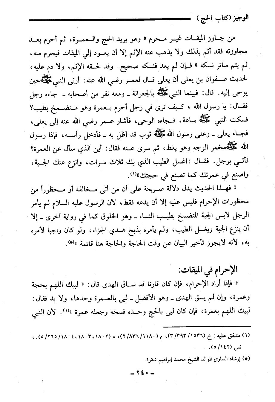 "فهذا الحديث يدل دلالة صريحة على أن من أتى مخالفة أو محظورًا من محظورات الإحرام فليس عليه إلا أن يدعه فقط؛ لأن الرسول عليه السلام لم يأمر الرجل لابس الجبة المتضمخ بطيب النساء -وهو الخلوق كما في رواية أخرى- إلا أن ينزع الجبة ويغسل الطيب، ولم يأمره بذبح هدي الجزاء، ولو كان واجبا لأمره به؛ لأنه لا يجوز تأخير البيان عن وقت الحاجة والحاجة هنا قائمة" (*).