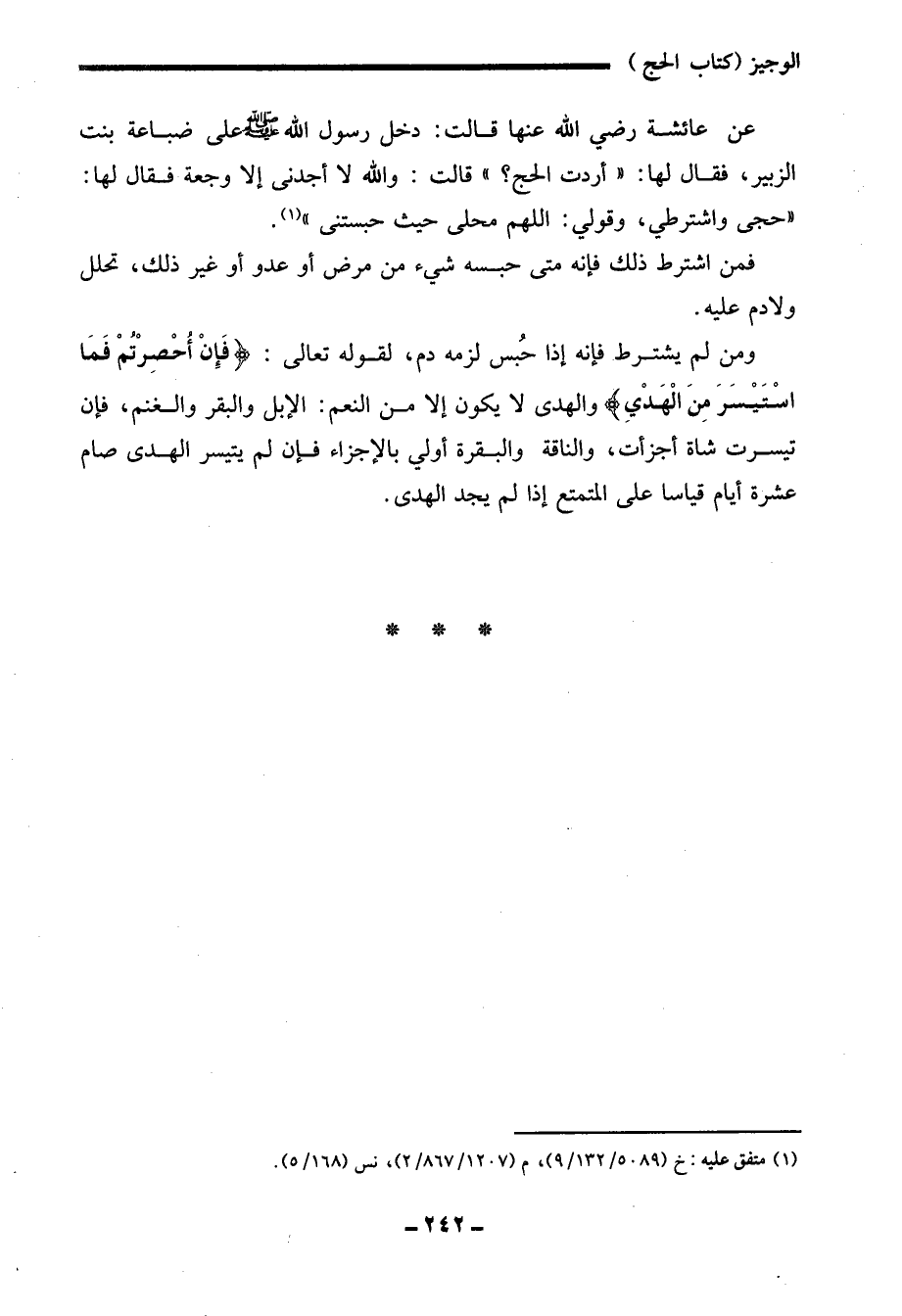 عن عائشة رضي الله عنها قالت: دخل رسول الله - صلى الله عليه وسلم - علي ضباعة بنت الزبير، فقال لها: "أردت الحج؟ " قالت: والله لا أجدنى إلا وجعة فقال لها: "حجى واشترطي، وقولي: اللهم على حيث حبستنى" (¬1).