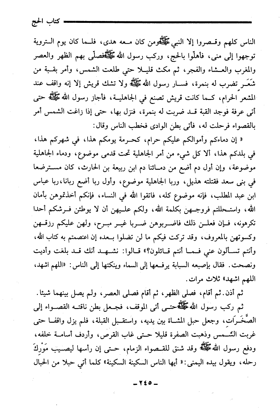 "إن دماءكم وأموالكم عليكم حرام، كحرمة يومكم هذا، في شهركم هذا، في بلدكم هذا، ألا كل شيء من أمر الجاهلية تحت قدمى موضوع، ودماء الجاهلية موضوعة، وإن أول دم أضع من دمائنا دم ابن ربيعة بن الحارث، كان مسترضعا في بني سعد فقتلته هذيل، وربا الجاهلية موضوع، وأول ربا أضع ربانا، ربا عباس ابن عبد المطلب، فإنه موضوع كله، فاتقوا الله في النساء، فإنكم أخذتموهن بأمان الله، واستحللتم فروجهن بكلمة الله، ولكم عليهن أن لا يوطئن فرشكم أحدا تكرهونه، فإن فعلن ذلك فاضربوهن ضربا غير مبرح، ولهن عليكم رزقهن وكسوتهن بالمعروف، وقد تركت فيكم ما لن تضلوا بعده إن اعتصمتم به كتاب الله، وأنتم تسألون عني فما أنتم قائلون؟ " قالوا: نشهد أنك قد بلغت وأديت ونصحت. فقال بإصبعه السبابة يرفعها إلى السماء وينكتها إلى الناس: "اللهم اشهد، اللهم اشهد" ثلاث مرات.