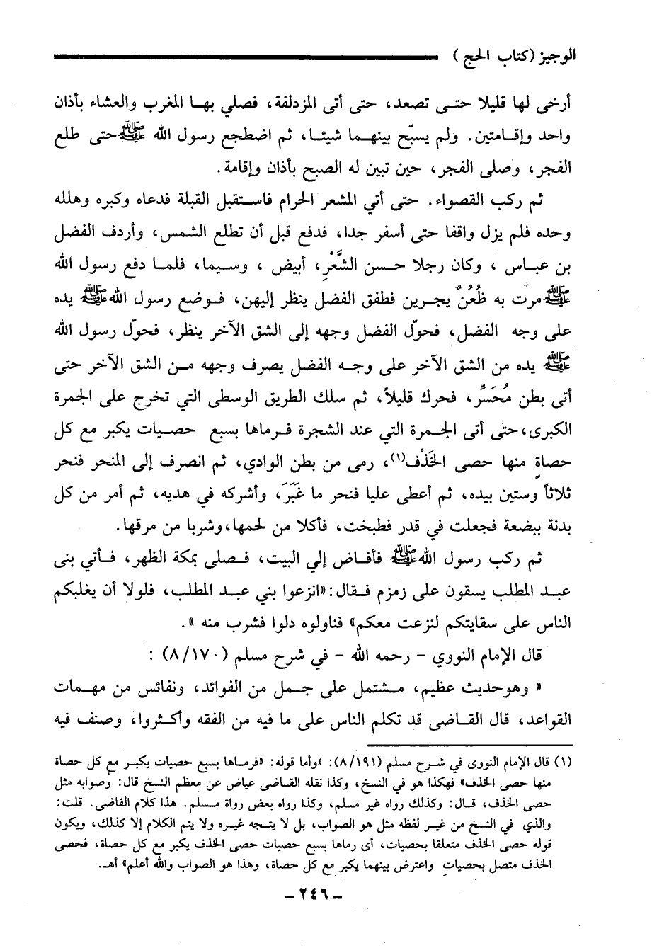 (¬1) قال الإِمام النووى في شرح مسلم (191/ 8): "وأما قوله: "فرماها بسع حصيات يكبر مع كل حصاة منها حصى الخذف" فهكذا هو في النسخ، وكذا نقله القاضى عياض عن معظم النسخ قال: وصوابه مثل حصى الخذف، قال: وكذلك رواه غير مسلم، وكذا رواه بعض رواة مسلم. هذا كلام القاضى. قلت: والذي في النسخ من غير لفظه مثل هو الصواب، بل لا يتجه غيره ولا يتم الكلام إلا كذلك، ويكون قوله حصى الخذف متعلقا بحصيات، أي رماها بسبع حصيات حصى الخذف يكبر مع كل حصاة، فحصى الخذف متصل بحصياتِ واعترض بينهما يكبر مع كل حصاة، وهذا هو الصواب والله أعلم" أهـ.