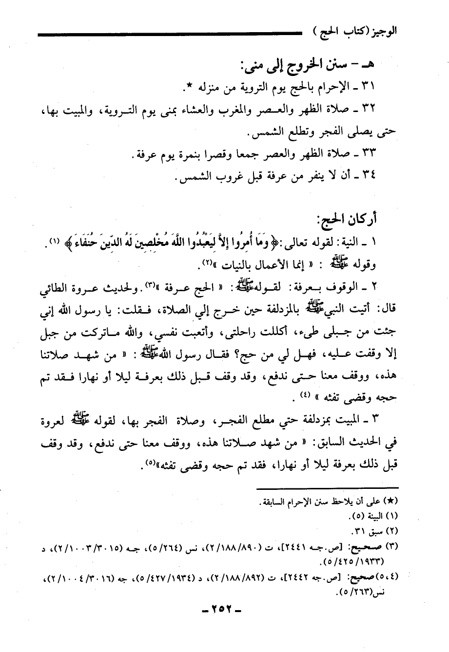 32 - صلاة الظهر والعصر والمغرب والعشاء بمنى يوم التروية، والمبيت بها، حتى يصلى الفجر وتطلع الشمس.