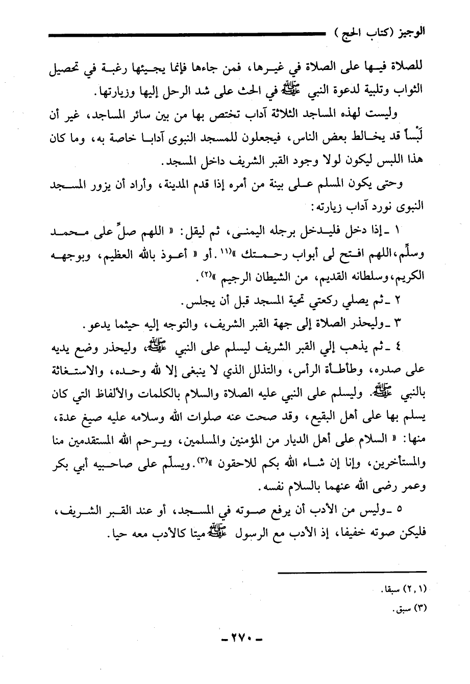 4 - ثم يذهب إلى القبر الشريف ليسلم على النبي - صلى الله عليه وسلم -، وليحذر وضع يديه على صدره، وطأطأة الرأس، والتذلل الذي لا ينبغى إلا لله وحده، والاستغاثة بالنبي - صلى الله عليه وسلم -. وليسلم على النبي عليه الصلاة والسلام بالكلمات والألفاظ التي كان يسلم بها على أهل البقيع، وقد صحت عنه صلوات الله وسلامه عليه صيغ عدة، منها: "السلام على أهل الديار من المؤمنين والمسلمين، ويرحم الله المستقدمين منا والمستأخرين، وإنا إن شاء الله بكم للاحقون" (¬3). ويسلم على صاحبيه أبي بكر وعمر - رضي الله عنهما - بالسلام نفسه.