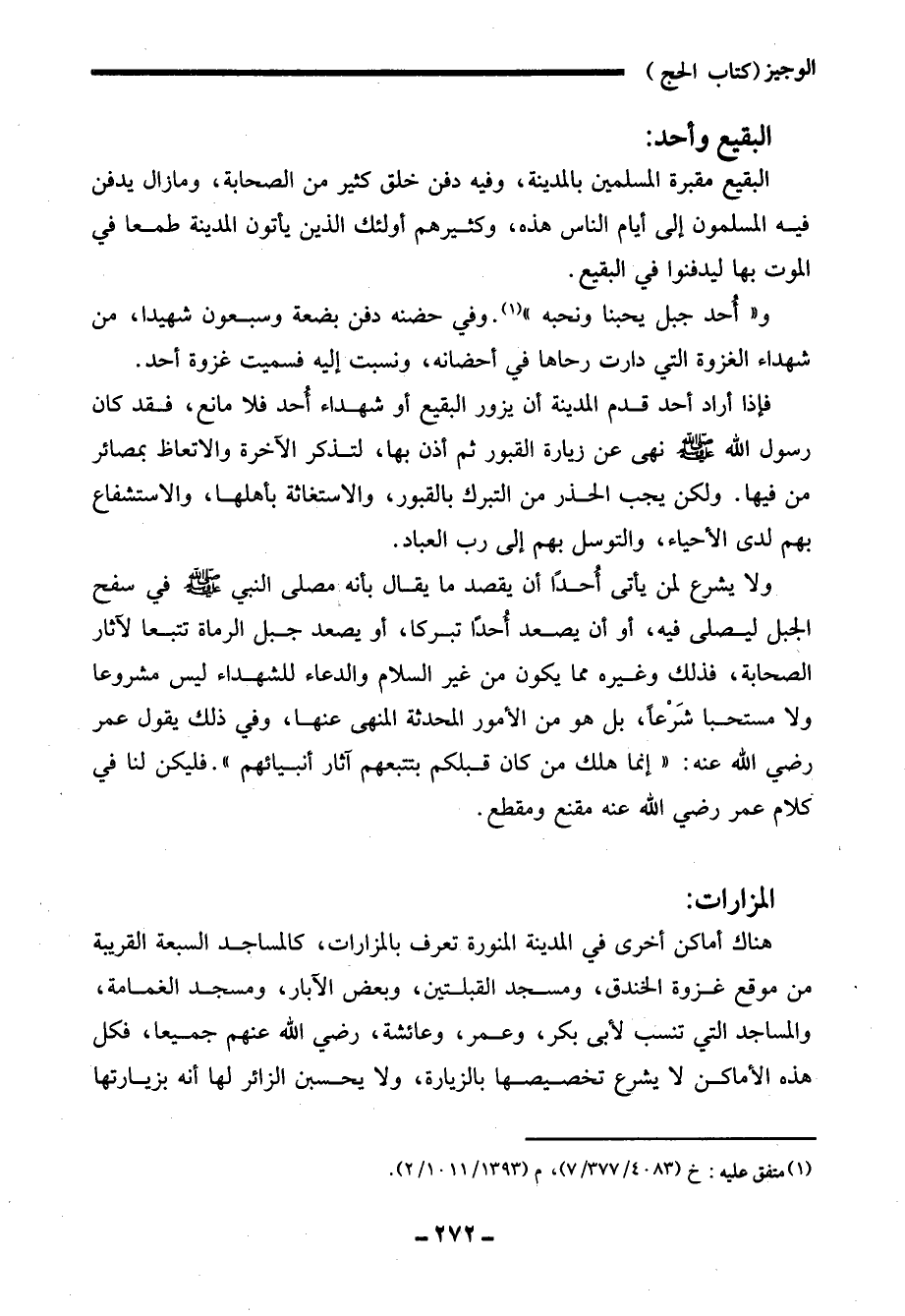 فإذا أراد أحد قدم المدينة أن يزور البقيع أو شهداء أُحد فلا مانع، فقد كان رسول الله - صلى الله عليه وسلم - نهى عن زيارة القبور ثم أذن بها، لتذكر الآخرة والاتعاظ بمصائر من فيها. ولكن يجب الحذر من التبرك بالقبور، والاستغاثة بأهلها، والاستشفاع بهم لدى الأحياء، والتوسل بهم إلى ربِّ العباد.