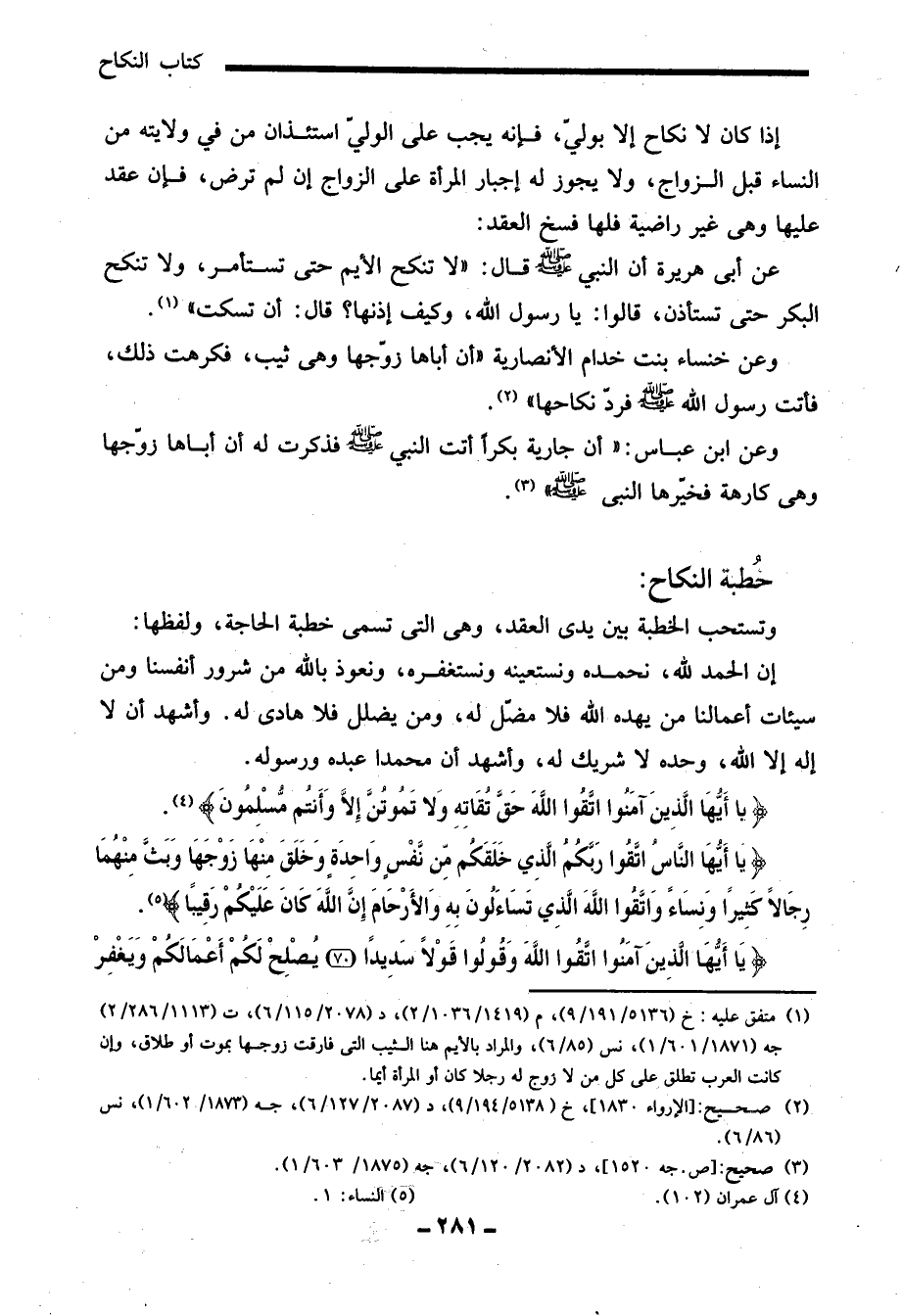 (¬1) متفق عليه: خ (5136/ 191/ 9)، م (1419/ 1036/ 2)، د (2078/ 115/ 6)، ت (1113/ 286/ 2) جه (1871/ 601/ 1)، نس (85/ 6)، والمراد بالأيم هنا الثيب التي فارقت زوجها بموت أو طلاق، وإن كانت العرب تطلق على كل من لا زوج له رجلًا كان أو المرأة أيما.