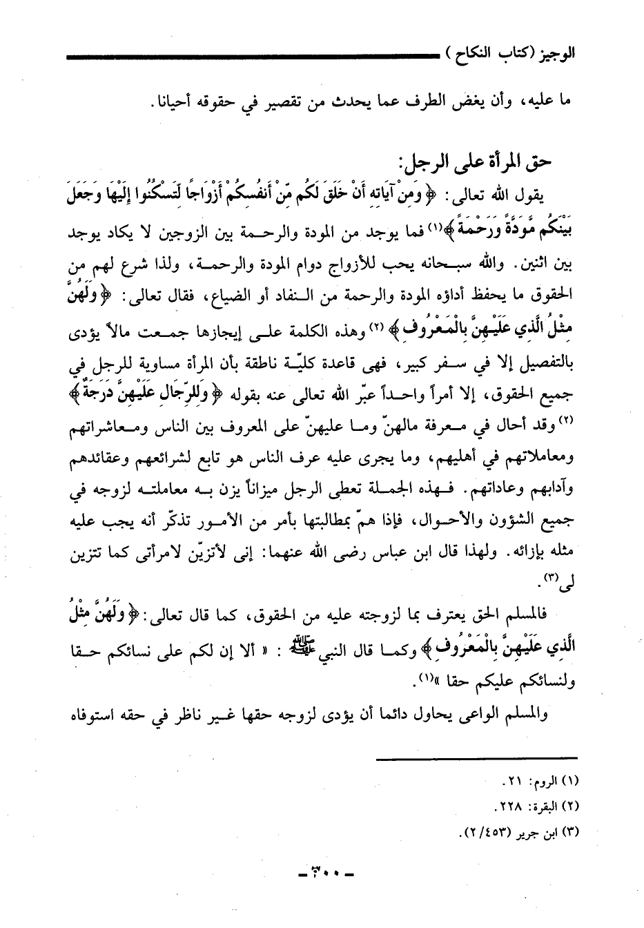 يقول الله تعالى: {وَمِنْ آيَاتِهِ أَنْ خَلَقَ لَكُمْ مِنْ أَنْفُسِكُمْ أَزْوَاجًا لِتَسْكُنُوا إِلَيْهَا وَجَعَلَ بَيْنَكُمْ مَوَدَّةً وَرَحْمَةً} (¬1) فما يوجد من المودة والرحمة بين الزوجين لا يكاد يوجد بين اثنين. والله سبحانه يحب للأزواج دوام المودة والرحمة، ولذا شرع لهم من الحقوق ما يحفظ أداؤه المودة والرحمة من النفاد أو الضياع، فقال تعالى: {وَلَهُنَّ مِثْلُ الَّذِي عَلَيْهِنَّ بِالْمَعْرُوفِ} (¬2) وهذه الكلمة على إيجازها جمعت مالًا يؤدى بالتفصيل إلا في سفر كبير، فهي قاعدة كليّة ناطقة بأن المرأة مساوية للرجل في جميع الحقوق، إلا أمرأَ واحدًا عبّر الله تعالى عنه بقوله {وَلِلرِّجَالِ عَلَيْهِنَّ دَرَجَةٌ} (2) وقد أحال في معرفة ما لهنّ وما عليهن على المعروف بين الناس ومعاشراتهم ومعاملاتهم في أهليهم، وما يجرى عليه عرف الناس هو تابع لشرائعهم وعقائدهم وآدابهم وعاداتهم. فهذه الجملة تعطى الرجل ميزانا يزن به معاملته لزوجه في جميع الشؤون والأحوال، فإذا همّ بمطالبتها بأمر من الأمور تذكّر أنه يجب عليه مثله بإزائه. ولهذا قال ابن عباس رضي الله عنهما: إنى لأتزيّن لامرأتى كما تتزين لي (¬3).