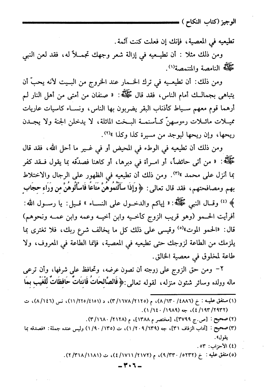 ومن ذلك أن تطيعيه في الوطء في المحيض أو في غير ما أحل الله، فقد قال - صلى الله عليه وسلم -: "من أتى حائضا، أو امرأة في دبرها، أو كاهنا فصدّقه بما يقول فقد كفر بما أنزل على محمَّد" (¬3). ومن ذلك أن تطيعيه في الظهوِر على الرجال والاختلاط بهم ومصافحتهم، فقد قال تعالى: {وَإِذَا سَأَلْتُمُوهُنَّ مَتَاعًا فَاسْأَلُوهُنَّ مِنْ وَرَاءِ حِجَابٍ} (¬4) وقال النبي - صلى الله عليه وسلم -: "إياكم والدخول على النساء" قيل: يا رسول الله: أفرأيت الحمو (وهو قريب الزوج كأخيه وابن أخيه وعمه وابن عمه ونحوهم) قال: "الحمو الموت" (¬5) وقيسى على ذلك كل ما يخالف شرع ربك، فلا تغترى بما يلزمك من الطاعة لزوجك حتى تطيعيه في المعصية، فإنما الطاعة في المعروف، ولا طاعة لمخلوق في معصية الخالق.