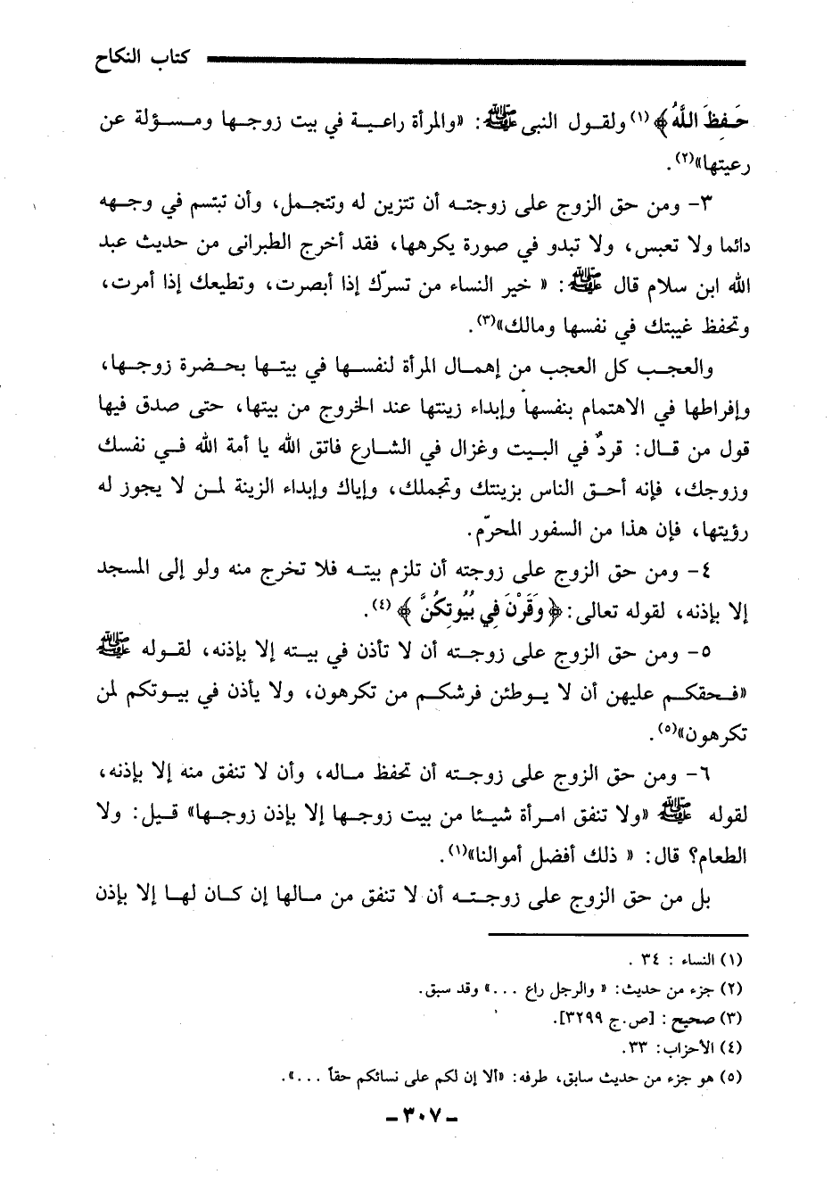 4 - ومن حق الزوج على زوجته أن تلزم بيته فلا تخرج منه ولو إلى المسجد إلا بإذنه، لقوله تعالى: {وَقَرْنَ فِي بُيُوتِكُنَّ} (¬4).