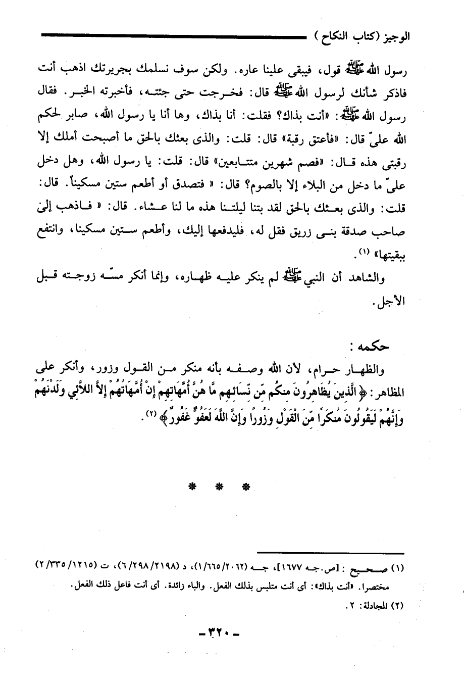 رسول الله - صلى الله عليه وسلم - قول، فيبقى علينا عاره. ولكن سوف نسلمك بجريرتك اذهب أنت فاذكر شأنك لرسول الله - صلى الله عليه وسلم - قال: فخرجت حتى جئته، فأخبرته الخبر. فقال رسول الله - صلى الله عليه وسلم -: "أنت بذاك؟ فقلت: أنا بذاك، وها أنا يا رسول الله، صابر لحكم الله عليّ قال: "فأعتق رقبة" قال: قلت: والذي بعثك بالحق ما أصبحت أملك إلا رقبتي هذه قال: "فصم شهرين متتابعين" قال: قلت: يا رسول الله، وهل دخل عليّ ما دخل من البلاء إلا بالصوم؟ قال: "فتصدق أو أطعم ستين مسكينًا. قال: قلت: والذي بعثك بالحق لقد بتنا ليلتنا هذه ما لنا عشاء. قال: "فاذهب إلى صاحب صدقة بني زريق فقل له، فليدفعها إليك، وأطعم ستين مسكينا، وانتفع ببقيتها" (¬1).