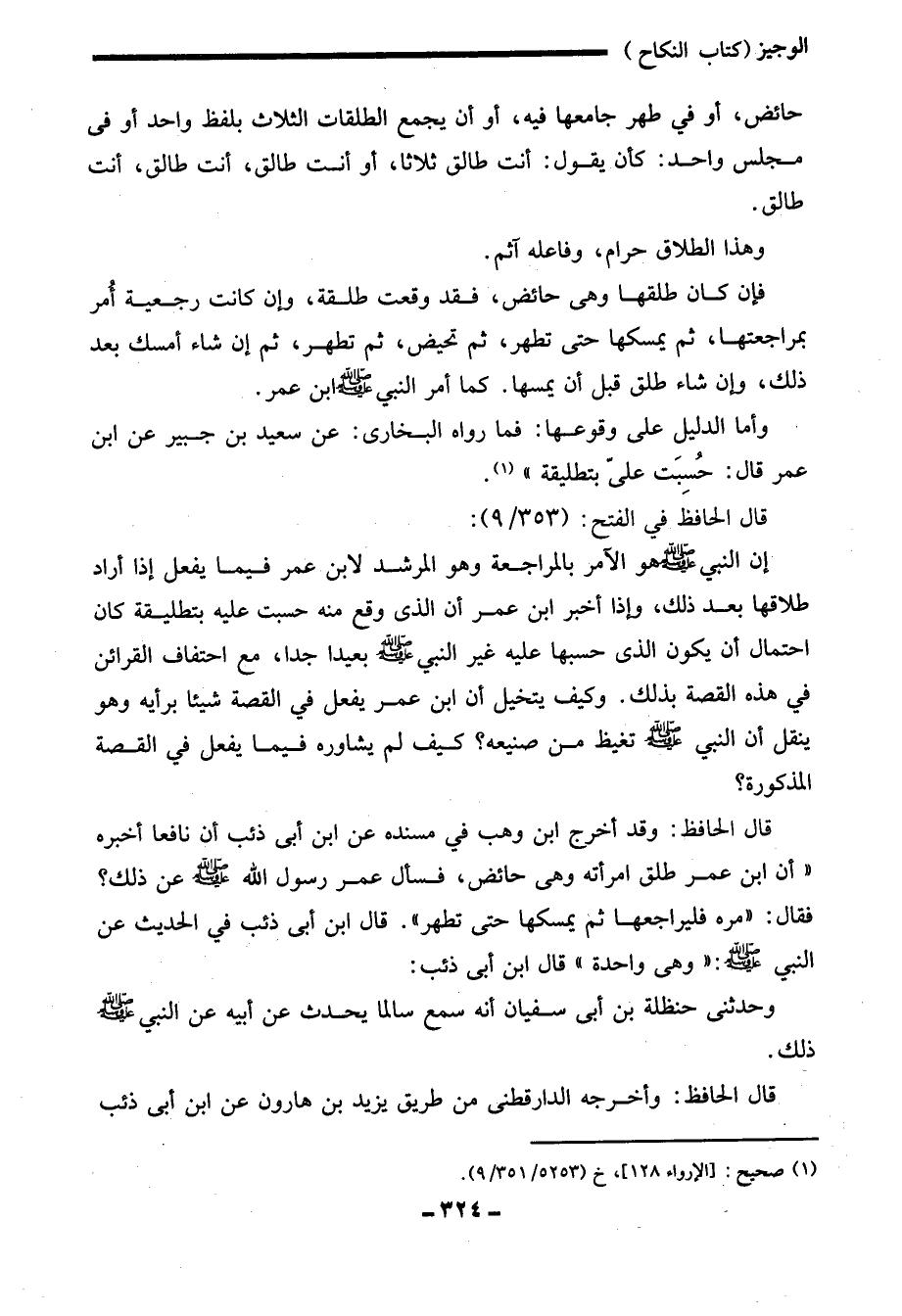 قال الحافظ: وقد أخرج ابن وهب في مسنده عن ابن أبي ذئب أن نافعا أخبره "أن ابن عمر طلق امرأته وهي حائض، فسأل عمر رسول الله - صلى الله عليه وسلم - عن ذلك؟ فقال: "مره فليراجعها ثم يمسكها حتى تطهر". قال ابن أبي ذئب في الحديث عن النبي - صلى الله عليه وسلم -:"وهي واحدة" قال ابن أبي ذئب: