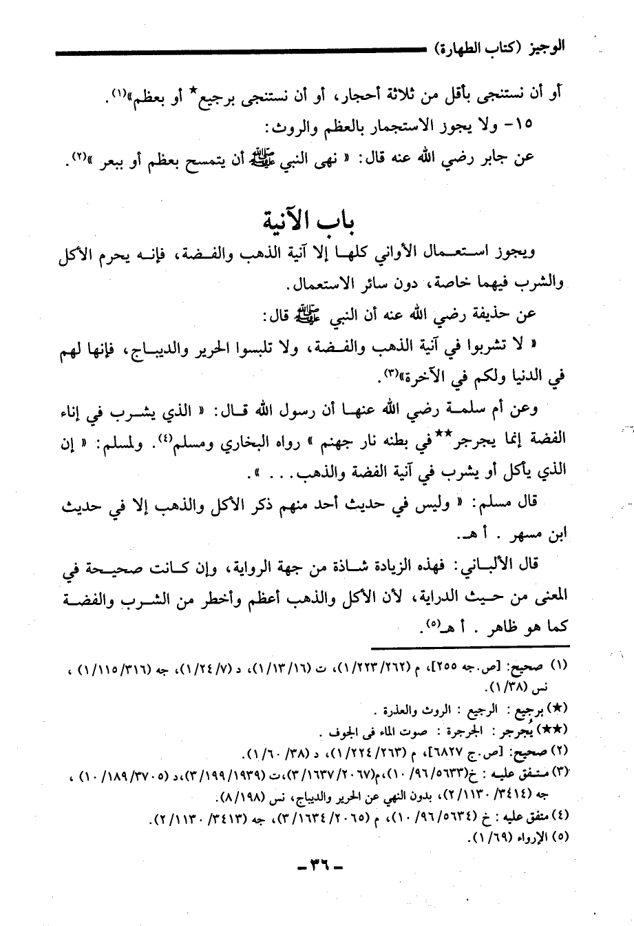 قال الألباني: فهذه الزيادة شاذة من جهة الرواية، وإن كانت صحيحة في المعنى من حيث الدراية، لأن الأكل والذهب أعظم وأخطر من الشرب والفضة كما هو ظاهر. أهـ (¬5).