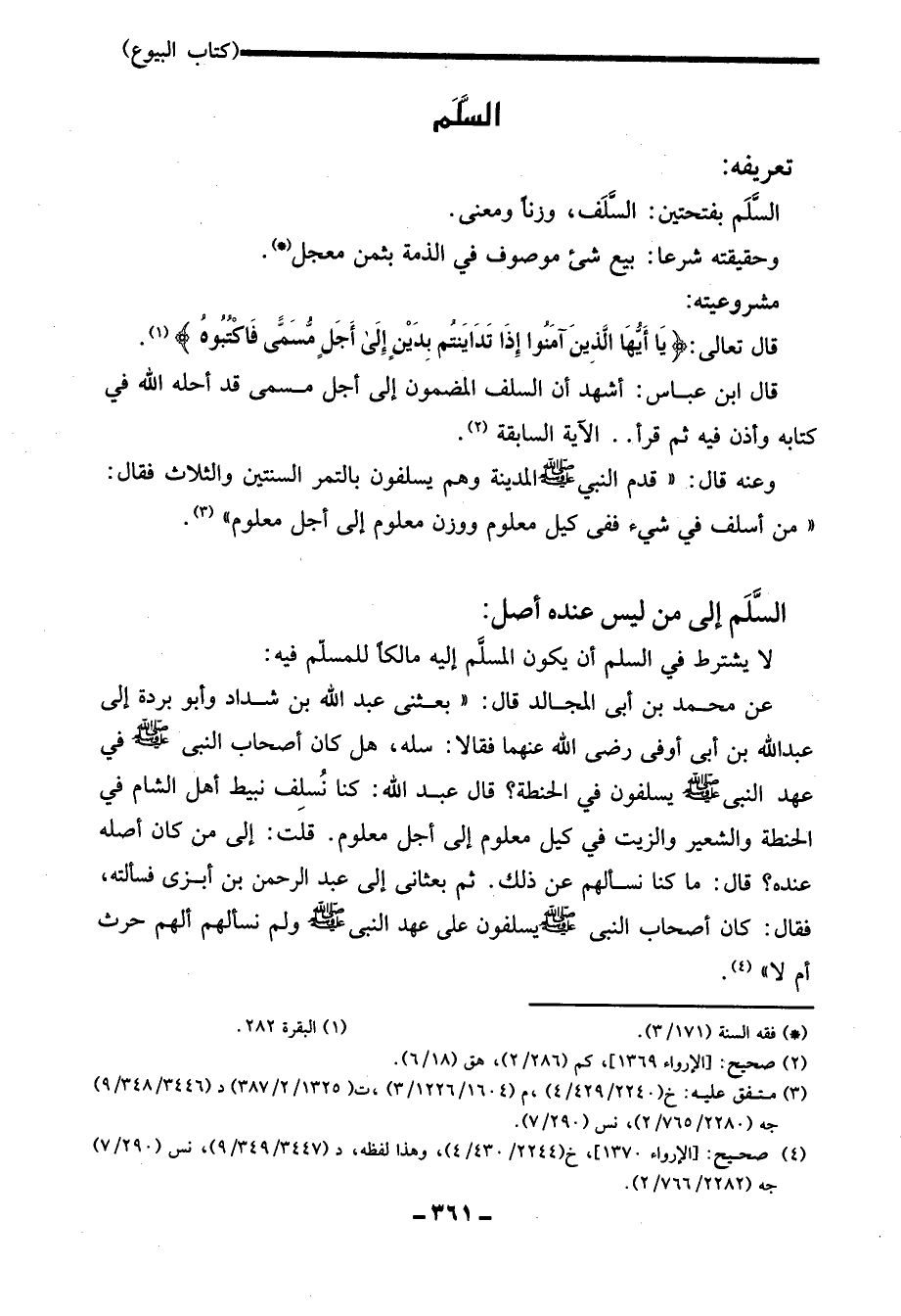 عن محمَّد بن أبي المجالد قال: "بعثنى عبد الله بن شداد وأبو بردة إلى عبد الله بن أبي أوفى رضي الله عنهما فقالا: سله، هل كان أصحاب النبي - صلى الله عليه وسلم - في عهد النبي - صلى الله عليه وسلم - يسلفون في الحنطة؟ قال عبد الله: كنا نُسلف نبيط أهل الشام في الحنطة والشعير والزيت في قيل معلوم إلى أجل معلوم. قلَت: إلى من كان أصله عنده؟ قال: ما كنا نسألهم عن ذلك. ثم بعثانى إلى عبد الرحمن بن أبزى فسألته، فقال: كان أصحاب النبي - صلى الله عليه وسلم - يسلفون على عهد النبي - صلى الله عليه وسلم - ولم نسالهم ألهم حرث أم لا" (¬4).