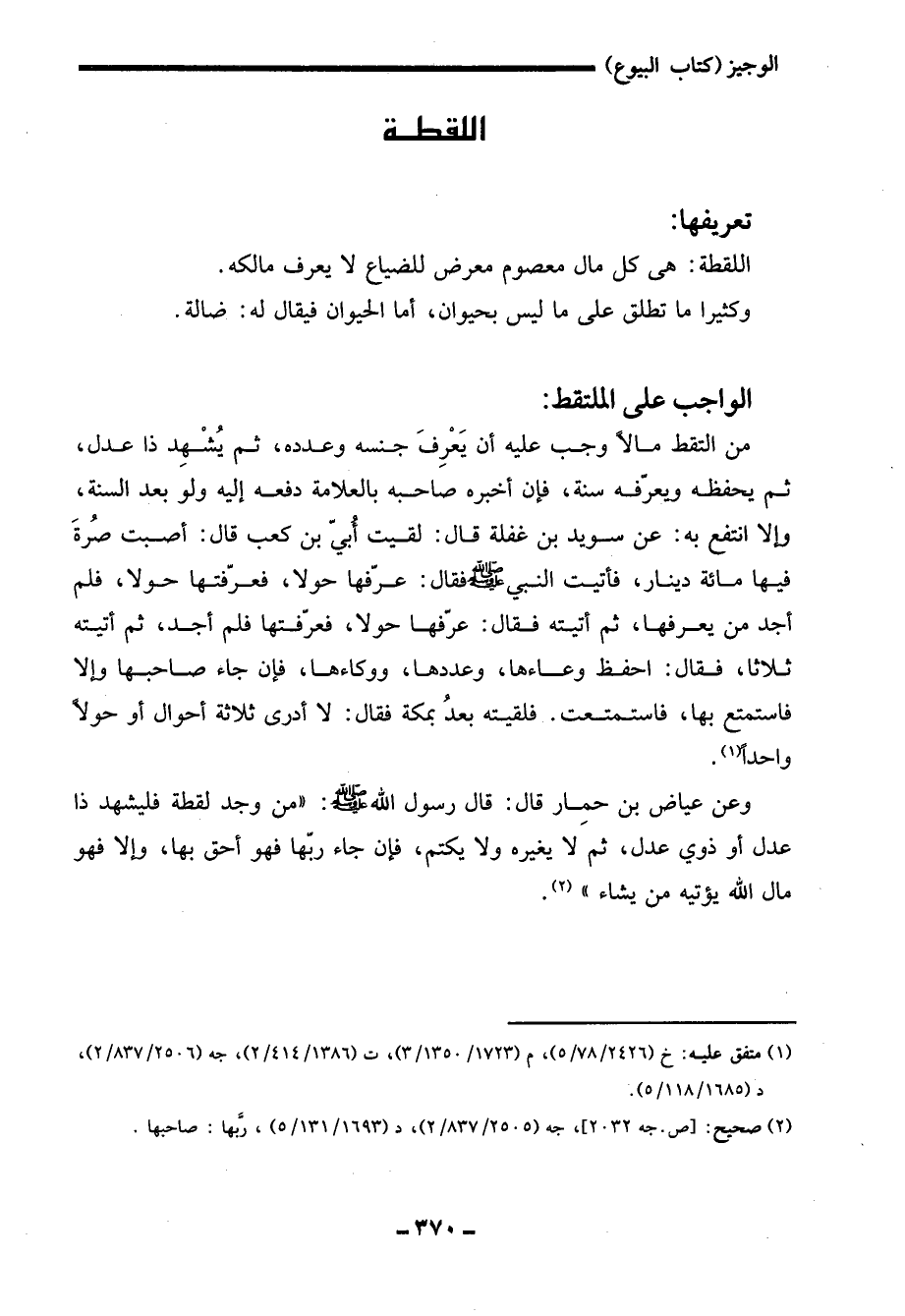 من التقط مالًا وجب عليه أن يَعْرِفَ جنسه وعدده، ثم يُشْهِد ذا عدل، ثم يحفظه ويعرّفه سنة، فإن أخبره صاحبه بالعلامة دفعه إليه ولو بعد السنة، وإلا انتفع به: عن سويد بن غفلة قال: لقيت أُبيّ بن كعب قال: أصبت صُرةَ فيها مائة دينار، فأتيت النبي - صلى الله عليه وسلم - فقال: عرّفها حولًا، فعرّفتها حولًا، فلم أجد من يعرفها، ثم أتيته فقال: عرّفها حولًا، فعرّفتها فلم أجد، ثم أتيته ثلاثًا، فقال: احفظ وعاءها، وعددها، ووكاءها، فإن جاء صاحبها وإلا فاستمتع بها، فاستمتعت. فلقيته بعدُ بمكة فقال: لا أْدرى ثلاثة أحوال أو حولًا واحدًا (¬1).