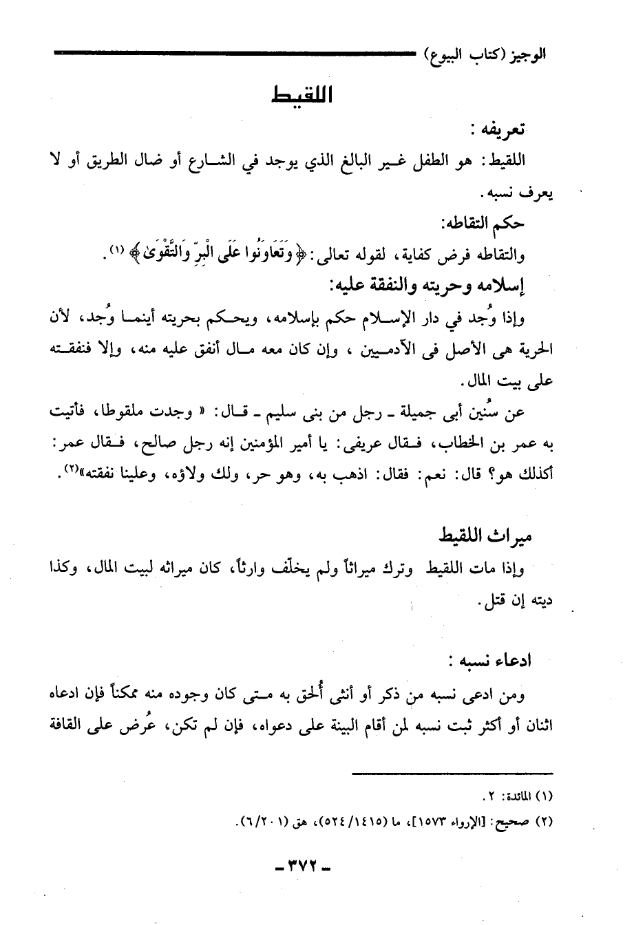 عن سُنين أبى جميلة -رجل من بني سليم- قال: "وجدت ملقوطا، فأتيت به عمر بن الخطاب، فقال عريفى: يا أمير المؤمنين إنه رجل صالح، فقال عمر: اكذلك هو؟ قال: نعم: فقال: اذهب به، وهو حر، ولك ولاؤه، وعلينا نفقته" (¬2).