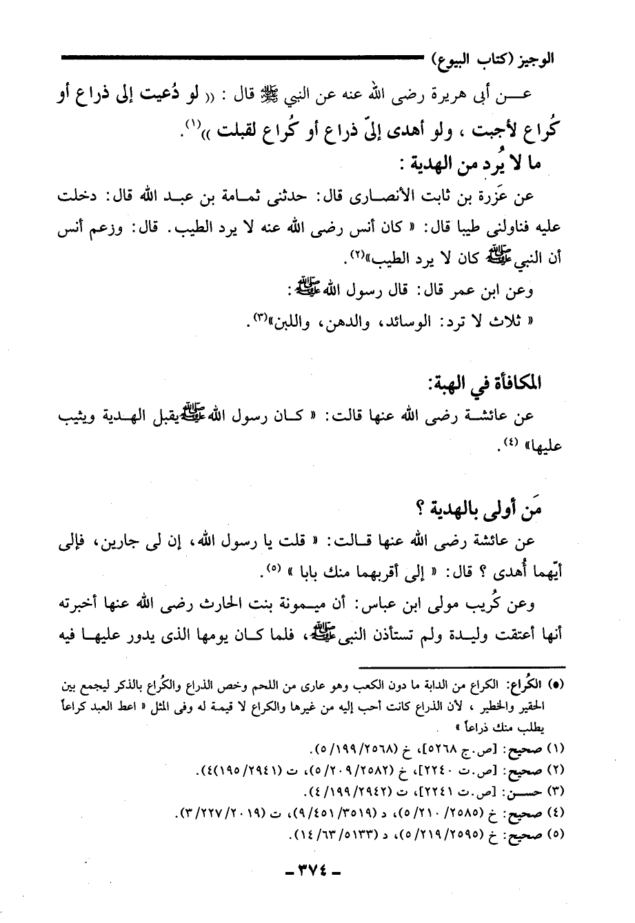 (*) الكُراع: الكراع من الدابة ما دون الكعب وهو عارى من اللحم وخص الذراع والكُراع بالذكر ليجمع بين الحقير والخطير، لأن الذراع كانت أحب إليه من غيرها والكراع لا قيمة له وفي المثل "اعط العبد كراعًا يطلب منك ذراعًا"
