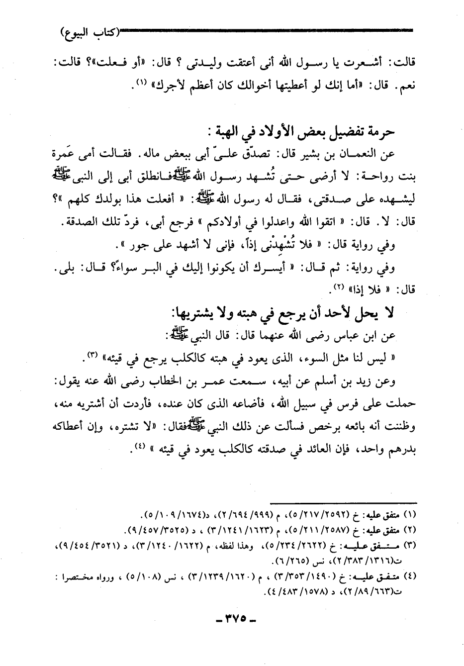 عن النعمان بن بشير قال: تصدّق علىّ أبى ببعض ماله. فقالت أمى عَمرة بنت رواحة: لا أرضى حتى تُشهد رسول الله - صلى الله عليه وسلم - فانطلق أبى إلى النبي - صلى الله عليه وسلم - ليشهده على صدقتى، فقال له رسول الله - صلى الله عليه وسلم -: "أفعلت هذا بولدك كلهم"؟ قال: لا. قال: "اتقوا الله واعدلوا في أولادكم" فرجع أبى، فردّ تلك الصدقة.