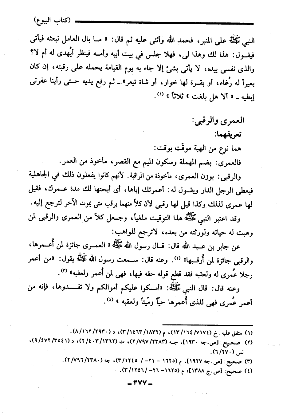 عن جابر بن عبد الله قال: قال رسول الله - صلى الله عليه وسلم - "العمرى جائزة لمن أُعمرها، والرقبى جائزة لمن أُرقبها" (¬2). وعنه قال: سمعت رسول الله - صلى الله عليه وسلم - يقول: "من أعمر رجلًا عُمرى له ولعقبه فقد قطع قوله حقه فيها، فهي لمن أُعمر ولعقبه" (¬3). وعنه قال: قال النبي - صلى الله عليه وسلم -: