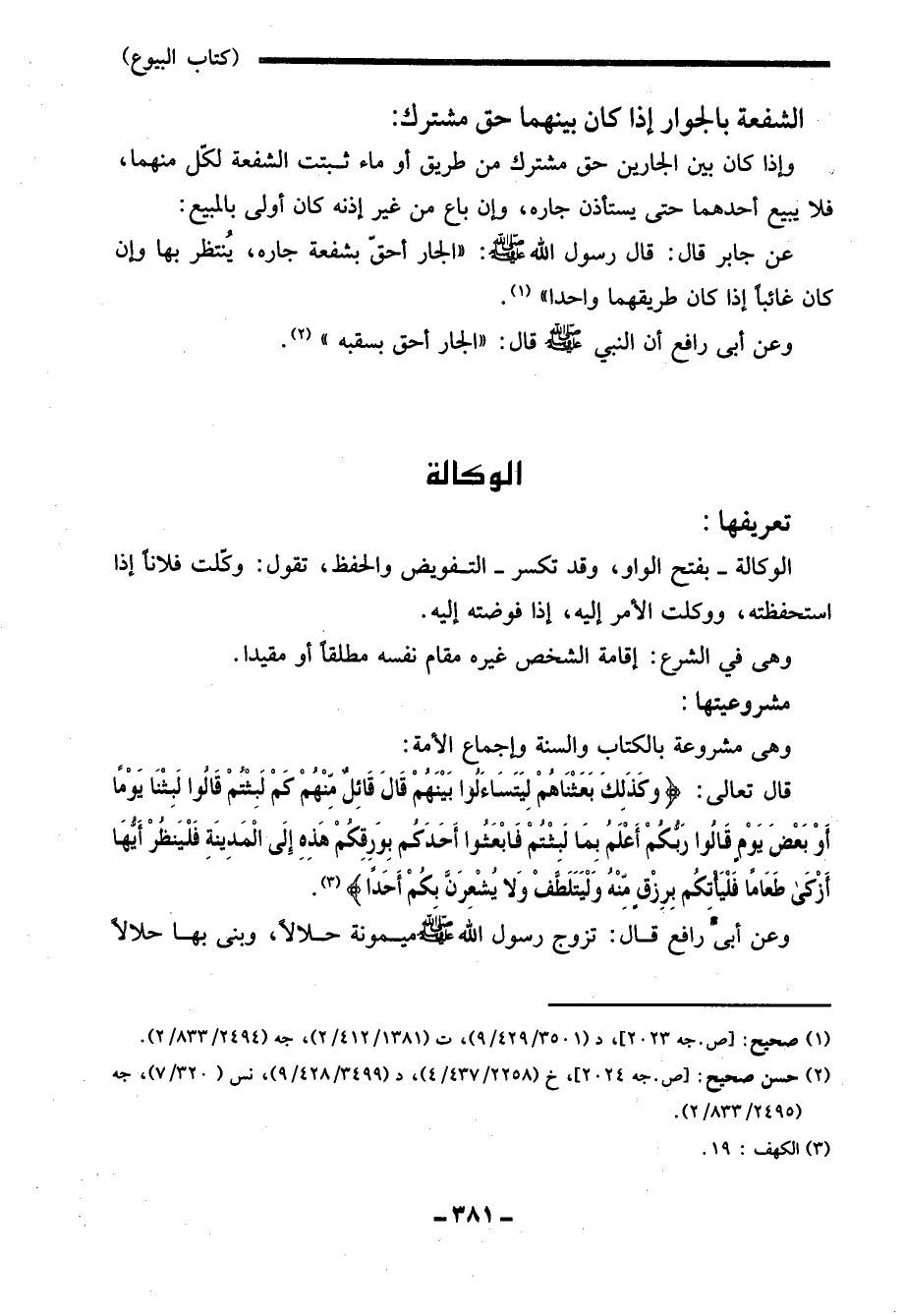 وإذا كان بين الجارين حق مشترك من طريق أو ماء ثبتت الشفعة لكّل منهما، فلا يبيع أحدهما حتى يستأذن جاره، وإن باع من غير إذنه كان أولى بالمبيع: