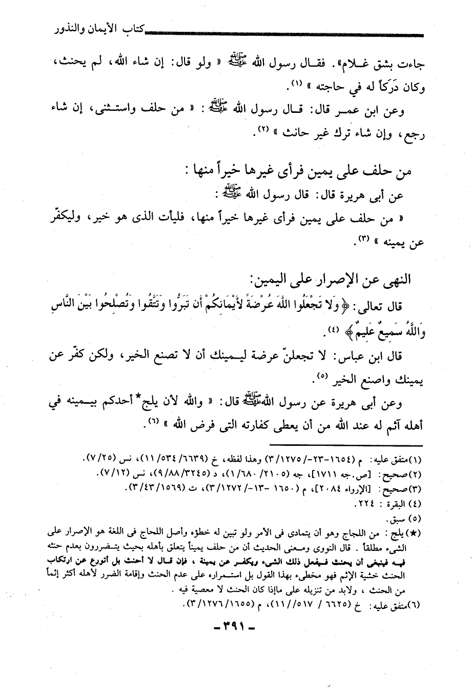 (*) يلج: من اللجاج وهو أن يتمادى في الأمر ولو تبين له خطؤه وأصل اللجاج في اللغة هو الإصرار على الشىء مطلقًا. قال النووى ومعنى الحديث أن من حلف يمينًا يتعلق بأهله بحيث يتضررون بعدم حنثه فيه فينبغى أن يحنث فيفعل ذلك الشيء ويكفر عن يمينه، فإن قال لا أحنث بل أتورع عن ارتكاب الحنث خشية الإثم فهو مخطىء بهذا القول بل استمراره على عدم الحنث وإقامة الضرر لأهله أكثر إثمًا من الحنث، ولا بد من تنزيله على ما إذا كان الحنث لا معصية فيه.
