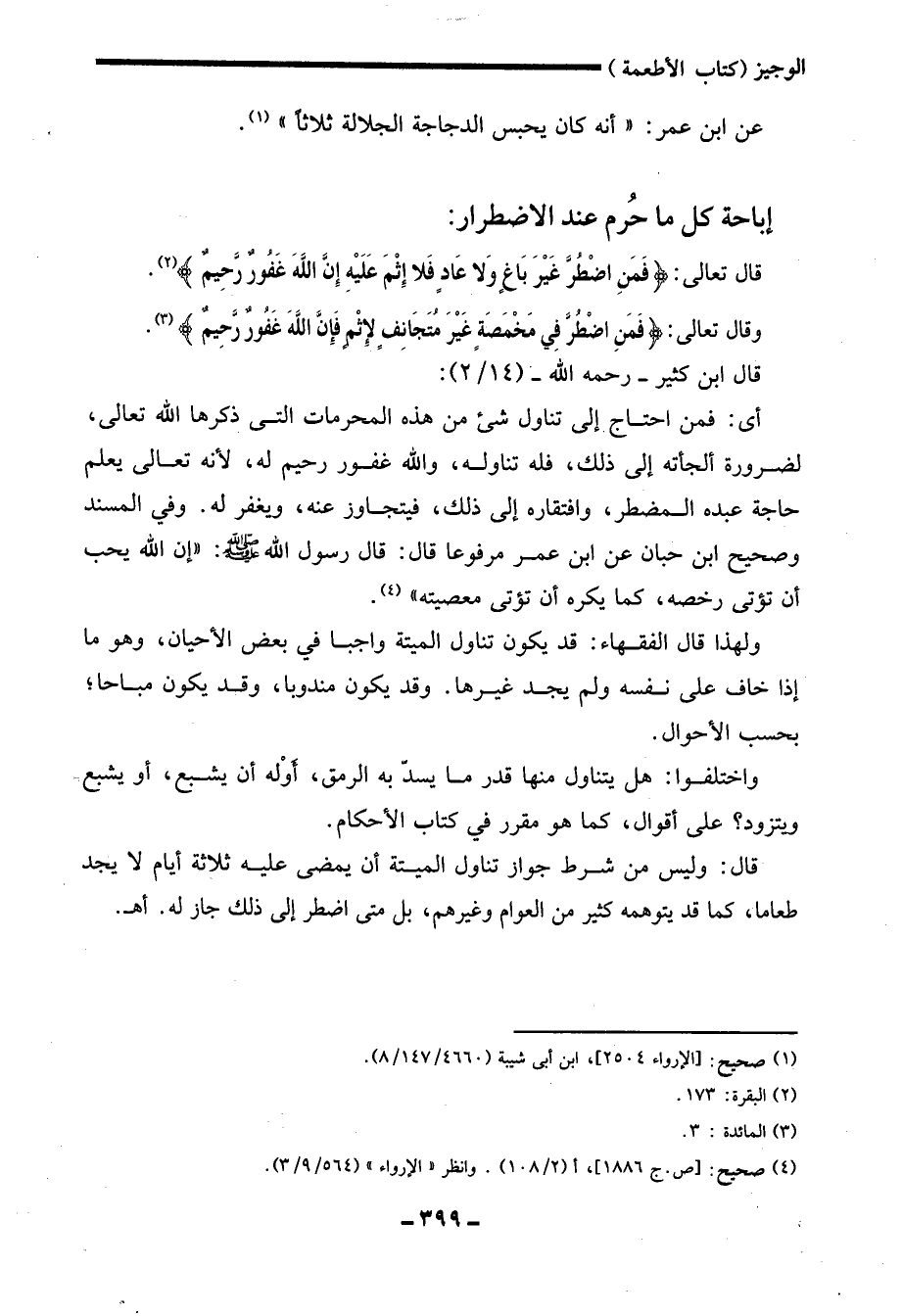 قال تعالى: {فَمَنِ اضْطُرَّ غَيْرَ بَاغٍ وَلَا عَادٍ فَلَا إِثْمَ عَلَيْهِ إِنَّ اللَّهَ غَفُورٌ رَحِيمٌ} (¬2).