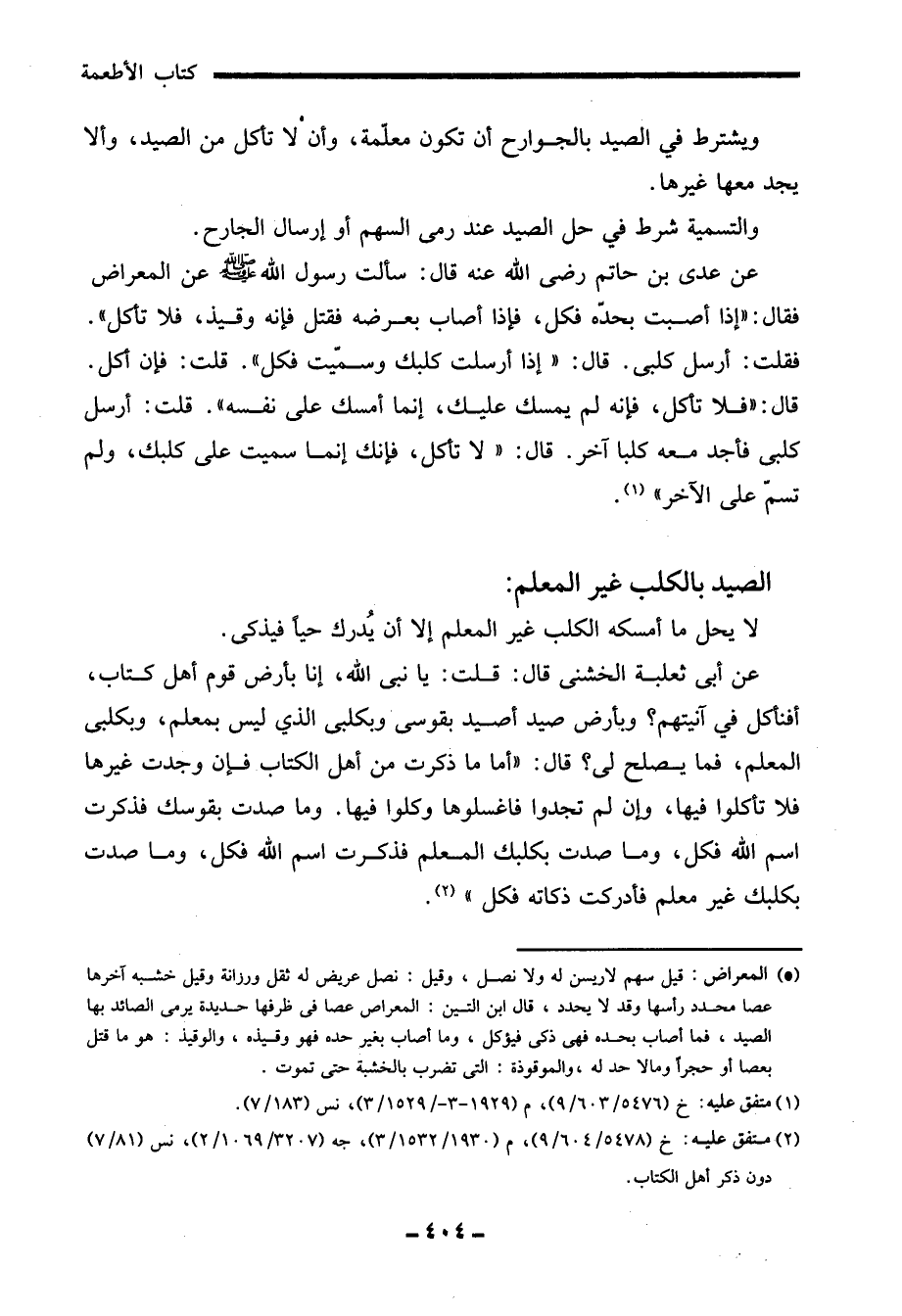 عن عدى بن حاتم رضي الله عنه قال: سألت رسول الله - صلى الله عليه وسلم - عن المعراض فقال: "إذا أصبت بحدّه فكل، فأذا أصاب بعرضه فقتل فإنه وقيذ، فلا تأكل". فقلت: أرسل كلبى. قال: "إذا أرسلت كلبك وسمّيت فكل". قلت: فإن أكل. قال: "فلا تأكل، فإنه لم يمسك عليك، إنما أمسك على نفسه". قلت: أرسل كلبى فأجد معه كلبا آخر. قال: "لا تأكل، فإنك إنما سميت على كلبك، ولم تسمّ على الآخر" (¬1).