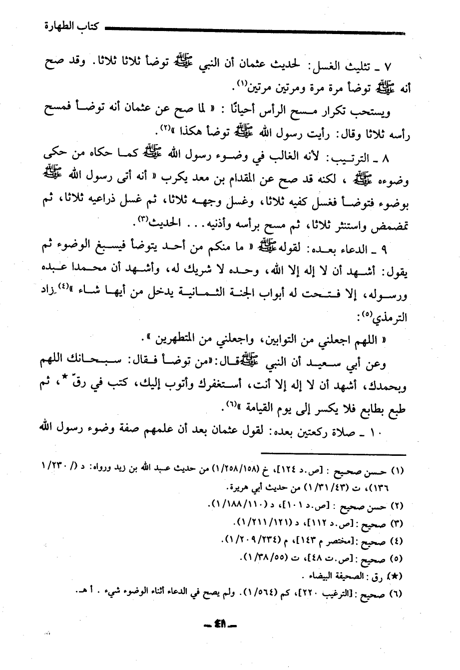 7 - تثليث الغسل: لحديث عثمان أن النبي - صلى الله عليه وسلم - توضأ ثلاثا ثلاثا. وقد صح أنه - صلى الله عليه وسلم - توضأ مرة مرة ومرتين مرتين (¬1).