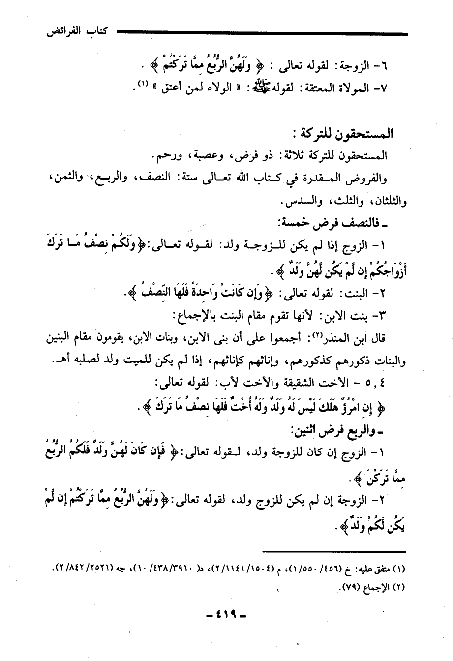 1 - الزوج إذا لم يكن للزوجة ولد: لقوله تعالى: {وَلَكُمْ نِصْفُ مَا تَرَكَ أَزْوَاجُكُمْ إِنْ لَمْ يَكُنْ لَهُنَّ وَلَدٌ}.
