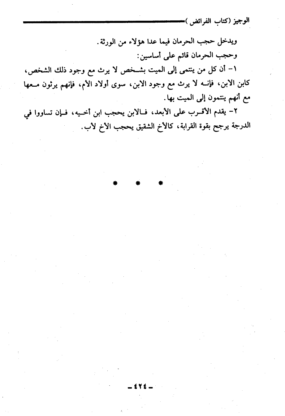1 - أن كل من ينتمي إلى الميت بشخص لا يرث مع وجود ذلك الشخص، كابن الابن، فإنه لا يرث مع وجود الابن، سوى أولاد الأم، فإنهم يرثون معها مع أنهم ينتمون إلى الميت بها.