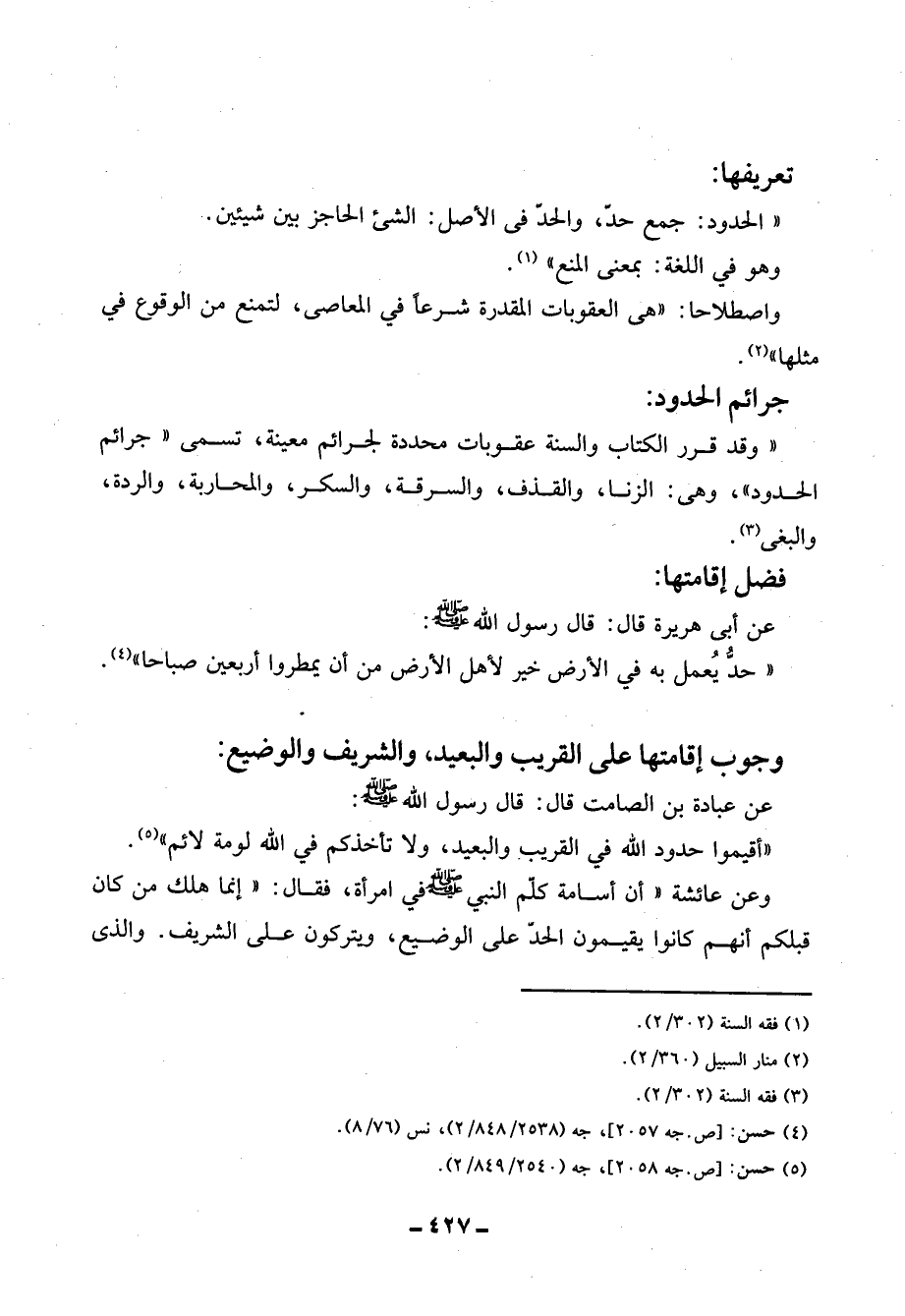 " وقد قرر الكتاب والسنة عقوبات محددة لجرائم معينة، تسمى "جرائم الحدود"، وهي: الزنا، والقذف، والسرقة، والسكر، والمحاربة، والردة، والبغي (¬3).