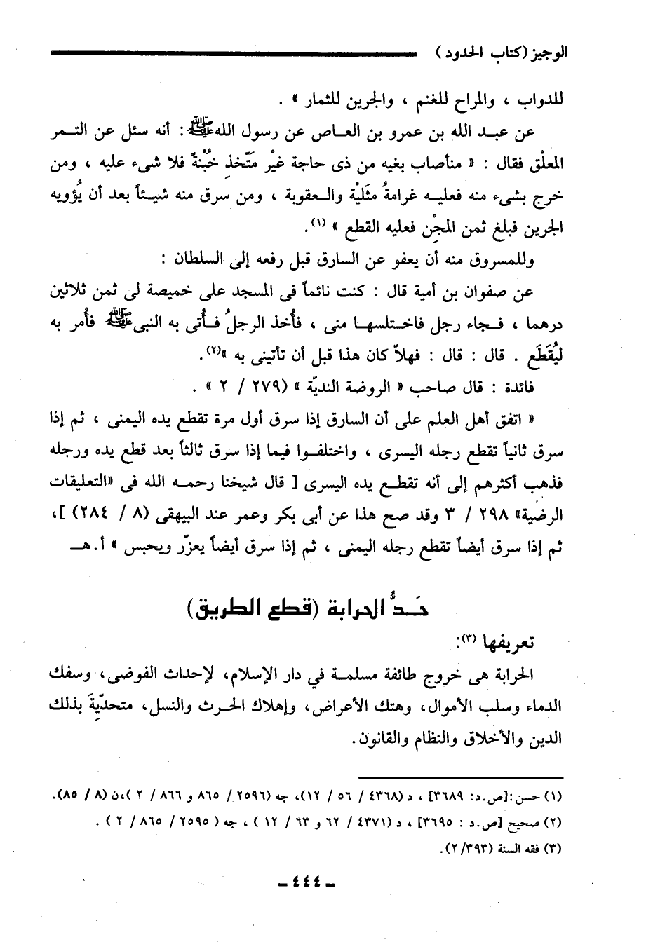 الحرابة هى خروج طائفة مسلمة في دار الإِسلام، لإحداث الفوضى، وسفك الدماء وسلب الأموال، وهتك الأعراض، وإهلاك الحرث والنسل، متحدّيِةَ بذلك الدين والأخلاق والنظام والقانون.