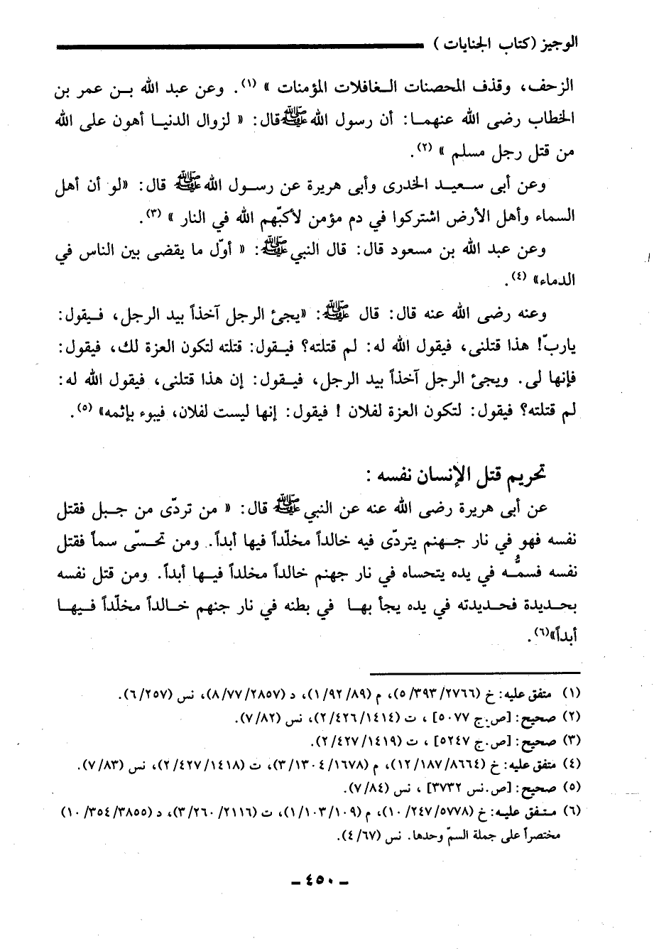 عن أبي هريرة رضي الله عنه عن النبي - صلى الله عليه وسلم - قال: "من تردّى من جبل فقتل نفسه فهو في نار جهنم يتردّى فيه خالدًا مخلّدًا فيها أبدًا. ومن تحسّى سمًا فقتل نفسه فسمُّه في يده يتحساه في نار جهنم خالدًا مخلدًا فيها أبدًا. ومن قتل نفسه بحديدة فحديدته في يده يجأ بها في بطنه في نار جنهم خالدًا مخلّدًا فيها أبدًا" (¬6).
