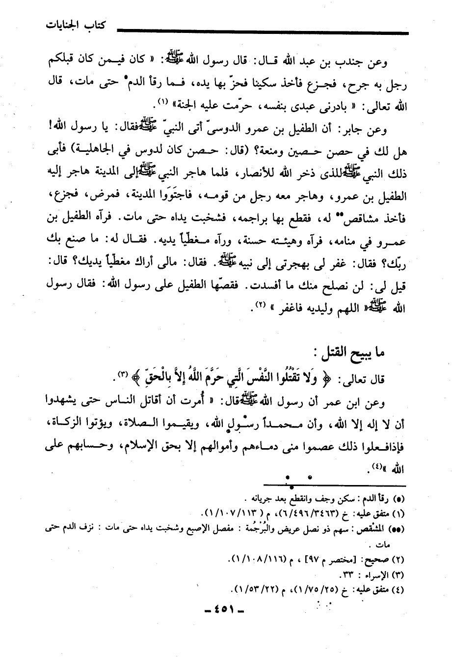 وعن جندب بن عبد الله قال: قال رسول الله صلى الله عليه وسلم: "كان فيمن كان قبلكم رجل به جرح، فجزع فأخذ سكينا فحزّ بها يده، فما رقأ الدم (*) حتى مات، قال الله تعالى: "بادرنى عبدي بنفسه، حرّمت عليه الجنة" (¬1).