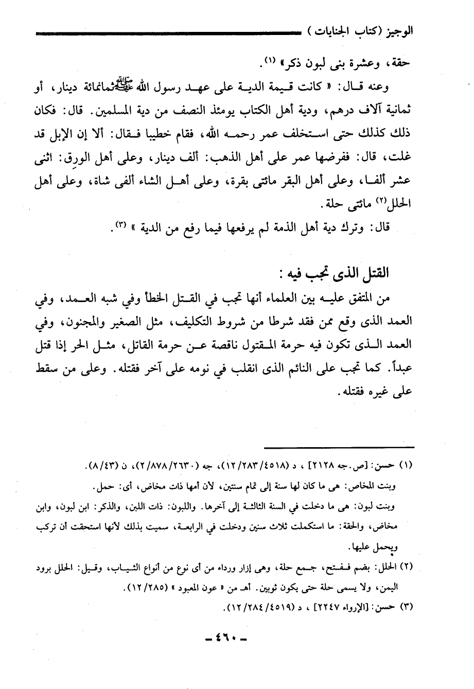 وعنه قال: "كانت قيمة الدية على عهد رسول الله صلى الله عليه وسلم ثمانمائة دينار، أو ثمانية آلاف درهم، ودية أهل الكتاب يومئذ النصف من دية المسلمين. قال: فكان ذلك كذلك حتى استخلف عمر رحمه الله، فقام خطيبا فقال: ألا إن الإبل قد غلت، قال: ففرضها عمر على أهل الذهب: ألف دينار، وعلى أهل الورِق: اثنى عشر ألفا، وعلى أهل البقر مائتي بقرة، وعلى أهل النساء ألفى شاة، وعلى أهل الحلل (¬2) مائتى حلة.