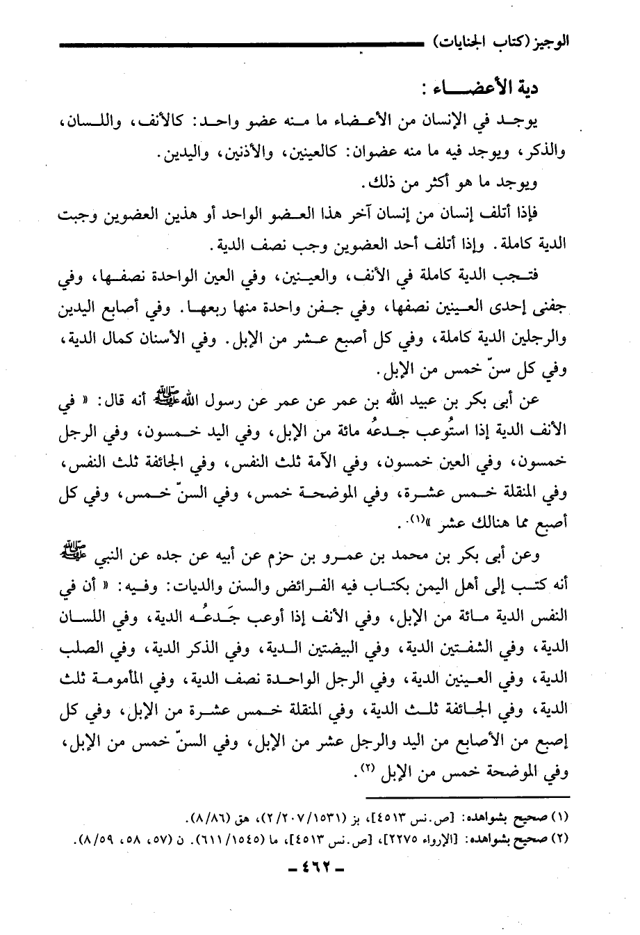وعن أبى بكر بن محمد بن عمرو بن حزم عن أبيه عن جده عن النبي - صلى الله عليه وسلم - أنه كتب إلى أهل اليمن بكتاب فيه الفرائض والسنن والديات: وفيه: "أن في النفس الدية مائة من الإبل، وفي الأنف إذا أوعب جَدعُه الدية، وفي اللسان الدية، وفي الشفتين الدية، وفي البيضتين الدية، وفي الذكر الدية، وفي الصلب الدية، وفي العينين الدية، وفي الرجل الواحدة نصف الدية، وفي المأمومة ثلث الدية، وفي الجائفة ثلث الدية، وفي المنقلة خمس عشرة من الإبل، وفي كل إصبع من الأصابع من اليد والرجل عشر من الإبل، وفي السنّ خمس من الإبل، وفي الموضحة خمس من الإبل (¬2).