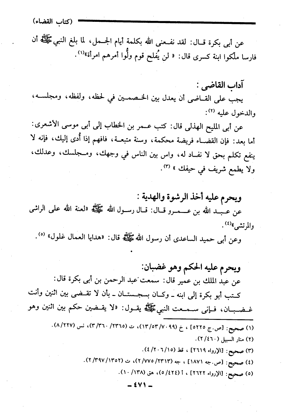 كتب أبو بكرة إلى ابنه -وكان بسجستان- بأن لا تقضى بين اثنين وأنت غضبان، فإنى سمعت النبي - صلى الله عليه وسلم - يقول: "لا يقضين حكم بين اثنين وهو
