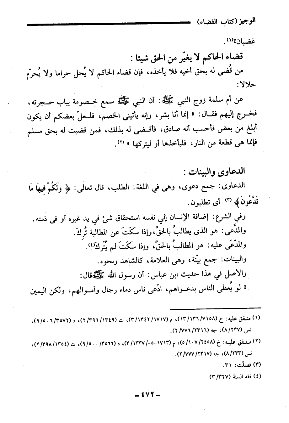 عن أم سلمة زوج النبي - صلى الله عليه وسلم -: أن النبي - صلى الله عليه وسلم - سمع خصومة بباب حجرته، فخرج إليهم فقال: "إنما أنا بشر، وإنه يأتينى الخصم، فلعلّ بعضكم أن يكون أبلغ من بعض فأحسب أنه صادق، فأقضى له بذلك، فمن قضيت له بحق مسلم فإنما هى قطعة من النار، فليأخذها أو ليتركها" (¬2).