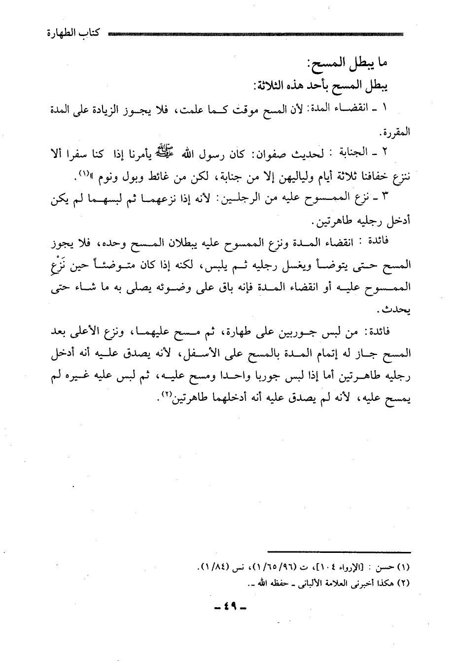 1 - انقضاء المدة: لأن المسح موقت كما علمت، فلا يجوز الزيادة على المدة المقررة.