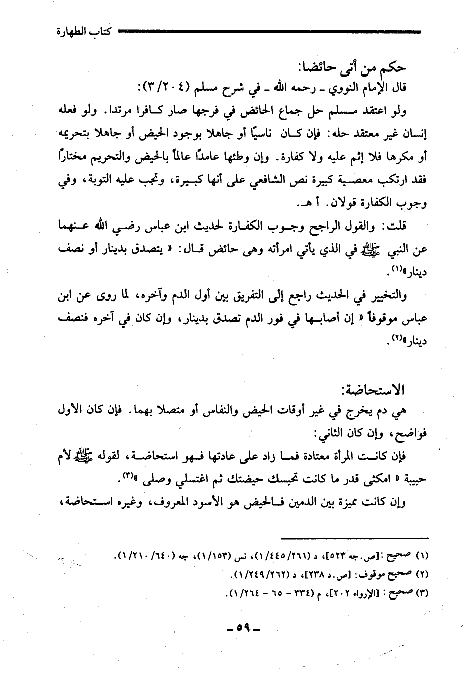 ولو اعتقد مسلم حل جماع الحائض في فرجها صار كافرًا مرتدًا. ولو فعله إنسان غير معتقد حله: فإن كان ناسيًا أو جاهلّا بوجود الحيض أو جاهلًا بتحريمه أو مكرهًا فلا إثم عليه ولا كفارة. وان وطئها عامدًا عالمًا بالحيض والتحريم مختارًا فقد ارتكب معصية كبيرة نص الشافعي على أنها كبيرة، وتجب عليه التوبة، وفي وجوب الكفارة قولان. اهـ.