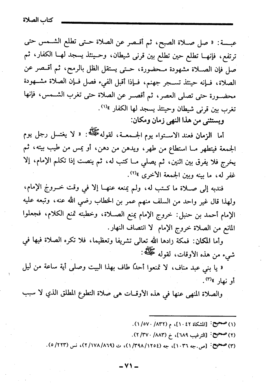 عبسة: "صل صلاة الصبح، ثم أقصر عن الصلاة حتى تطلع الشمس حتى ترتفع، فإنها تطلع حين تطلع بين قرنى شيطان، وحينئذ يسجد لها الكفار، ثم صل فإن الصلاة مشهودة محضورة، حتى يستقل الظل بالرمح، ثم أقصر عن الصلاة، فإنه حينئذ تسجر جهنم، فإذا أقبل الفيء فصل فإن الصلاة مشهودة محضورة حتى تصلى العصر، ثم أقصر عن الصلاة حتى تغرب الشمس، فإنها تغرب بين قرنى شيطان وحينئذ يسجد لها الكفار" (¬1).