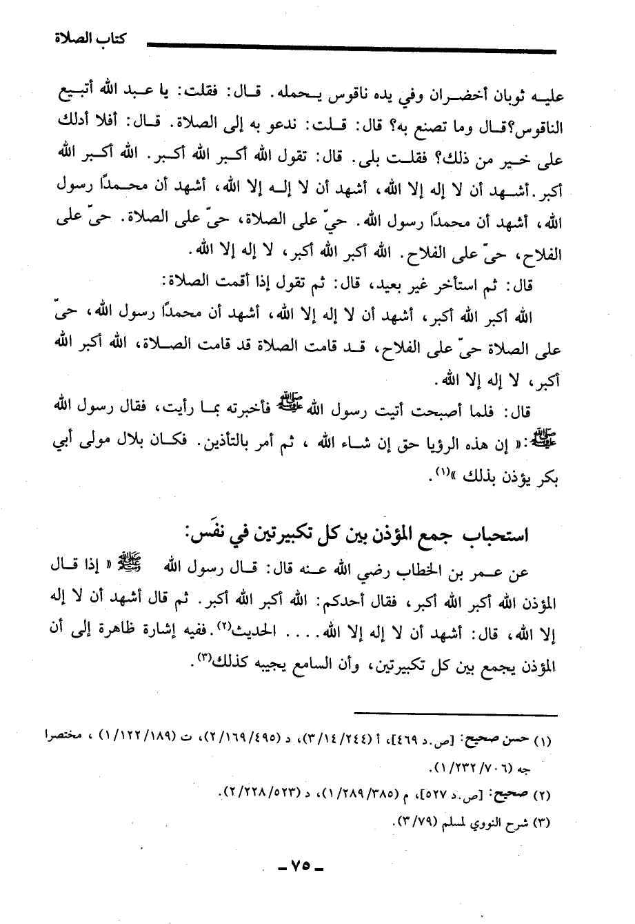 عليه ثوبان أخضران وفي يده ناقوس يحمله. قال: فقلت: يا عبد الله أتبيع الناقوس؟ قال وما تصنع به؟ قال: قلت: ندعو به إلى الصلاة. قال: أفلا أدلك على خير من ذلك؟ فقلت بلى. قال: تقول الله أكبر الله أكبر. الله أكبر الله أكبر. أشهد أن لا إله إلا الله، أشهد أن لا إله إلا الله، أشهد أن محمدًا رسول الله، أشهد أن محمدًا رسول الله. حيّ على الصلاة، حى على الصلاة. حىّ على الفلاح، حىّ على الفلاح. الله أكبر الله أكبر، لا إله إلا الله.