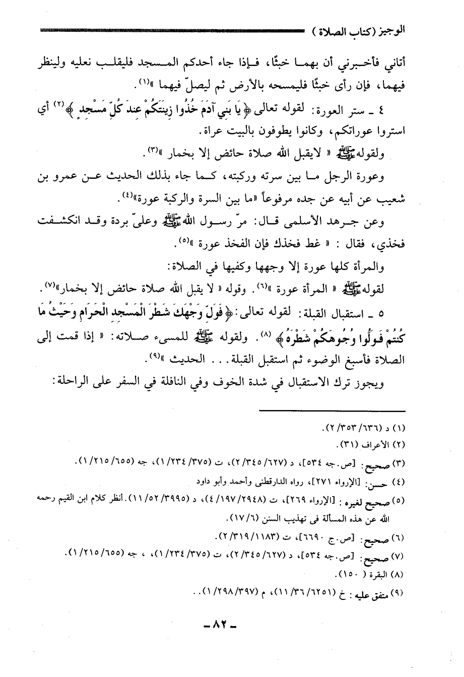 4 - ستر العورة: لقولى تعالى {يَا بَنِي آدَمَ خُذُوا زِينَتَكُمْ عِنْدَ كُلِّ مَسْجِدٍ} (¬2) أي استروا عوراتكم، وكانوا يطوفون بالبيت عراة.