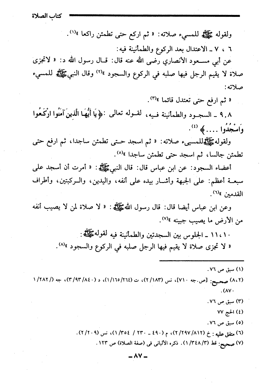عن أبي مسعود الأنصاري - رضي الله عنه - قال: قال رسول الله - صَلَّى اللَّهُ عَلَيْهِ وَسَلَّمَ -: "لا تجزى صلاة لا يقيم الرجل فيها صلبه في الركوع والسجود" (¬2) وقال النبي - صلى الله عليه وسلم - للمسيء صلاته:
