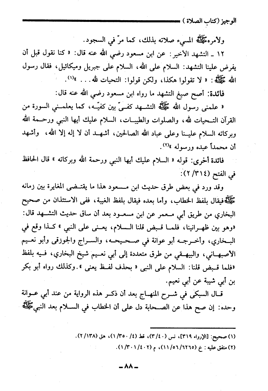 12 - التشهد الأخير: عن ابن مسعود رضي الله عنه قال: "كنا نقول قبل أن يفرض علينا التشهد: السلام على الله، السلام على جبريل وميكائيل، فقال رسول الله - صلى الله عليه وسلم -: "لا تقولوا هكذا, ولكن قولوا: التحيات لله ... " (¬1).