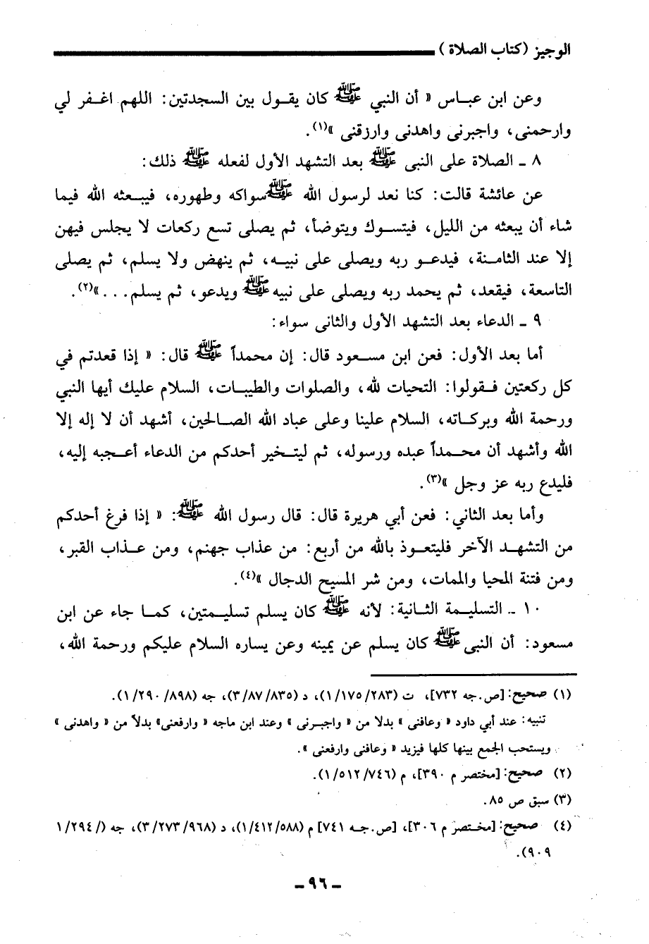 10 - التسليمة الثانية: لأنه - صلى الله عليه وسلم - كان يسلم تسليمتين، كما جاء عن ابن مسعود: أن النبي - صلى الله عليه وسلم - كان يسلم عن يمينه وعن يساره السلام عليكم ورحمة الله،