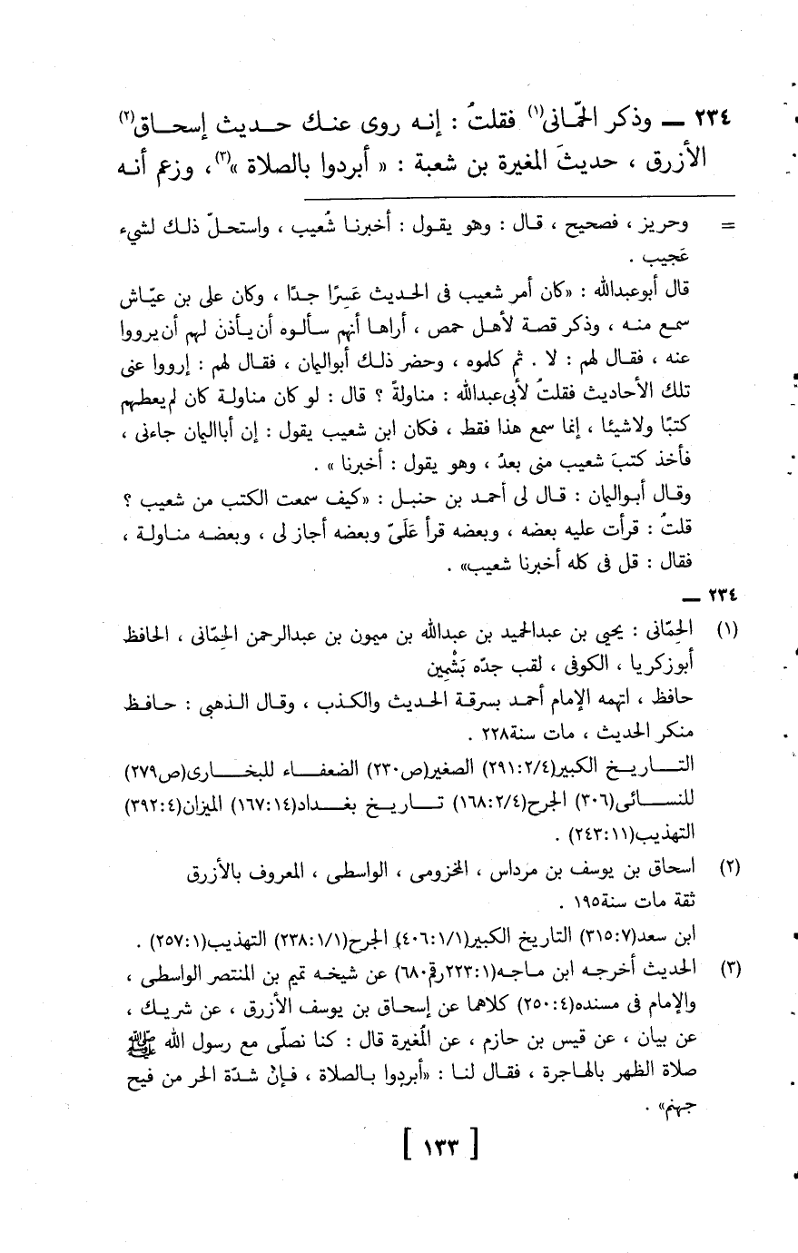 234 - وَذَكَرَ الْحِمَّانِيَّ , فَقُلْتُ: إِنَّهُ رَوَى عَنْكَ حَدِيثَ إِسْحَاقَ الْأَزْرَقِ، حَدِيثَ الْمُغِيرَةِ بْنِ شُعْبَةَ: أَبْرِدُوا بِالصَّلَاةِ، وَزَعَمَ أَنَّهُ